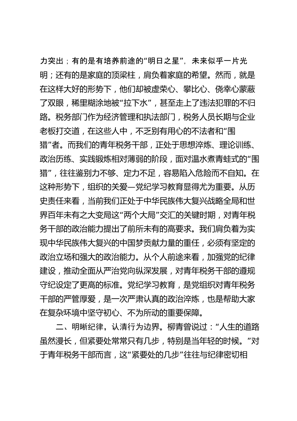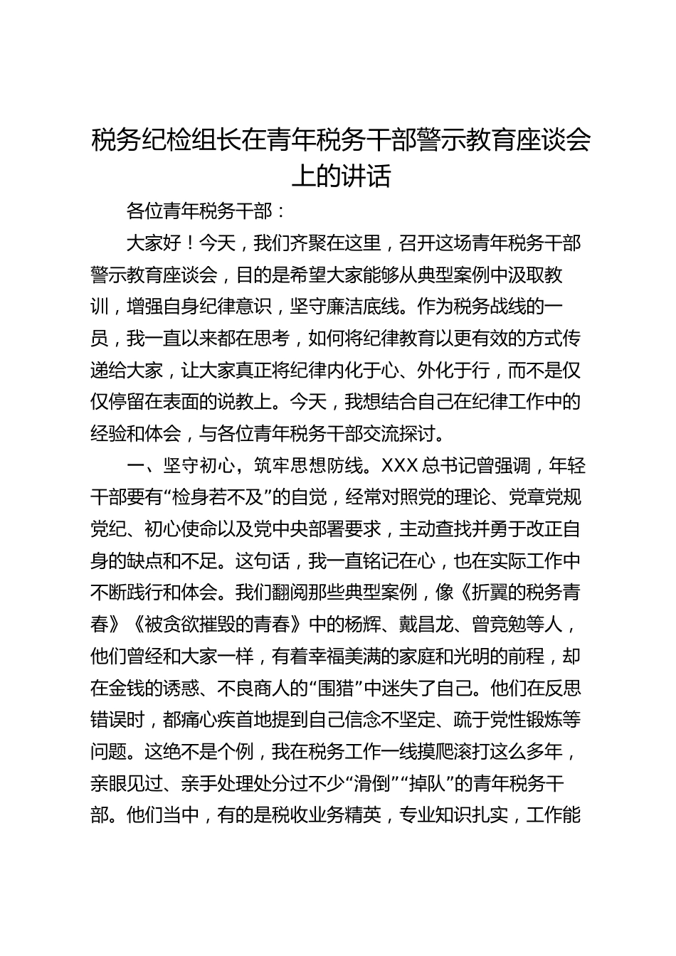 稅務(wù)紀(jì)檢組長在青年稅務(wù)干部警示教育座談會上的講話各位青年稅務(wù)干部:大家好!今天,我們齊聚在這里,召開這場青年稅務(wù)干部警示教育座談會,目的是希望大家能夠從典型案例中汲取教訓(xùn),增強自身紀(jì)律意識,堅守廉潔底線。作為稅務(wù)戰(zhàn)線的一員,我一直以來都在思考,如何將紀(jì)律教育以更有效的方式傳遞給大家,讓大家真正將紀(jì)律內(nèi)化于心、外化于行,而不是僅僅停留在表面的說教上。今天,我想結(jié)合自己在紀(jì)律工作中的經(jīng)驗和體會,與各位青年稅務(wù)干部交流探討。一、堅守初心,筑牢思想防線。XXX總書記曾強調(diào),年輕“”干部要有檢身若不及的自覺,經(jīng)常對照黨的理論、黨章黨規(guī)黨...