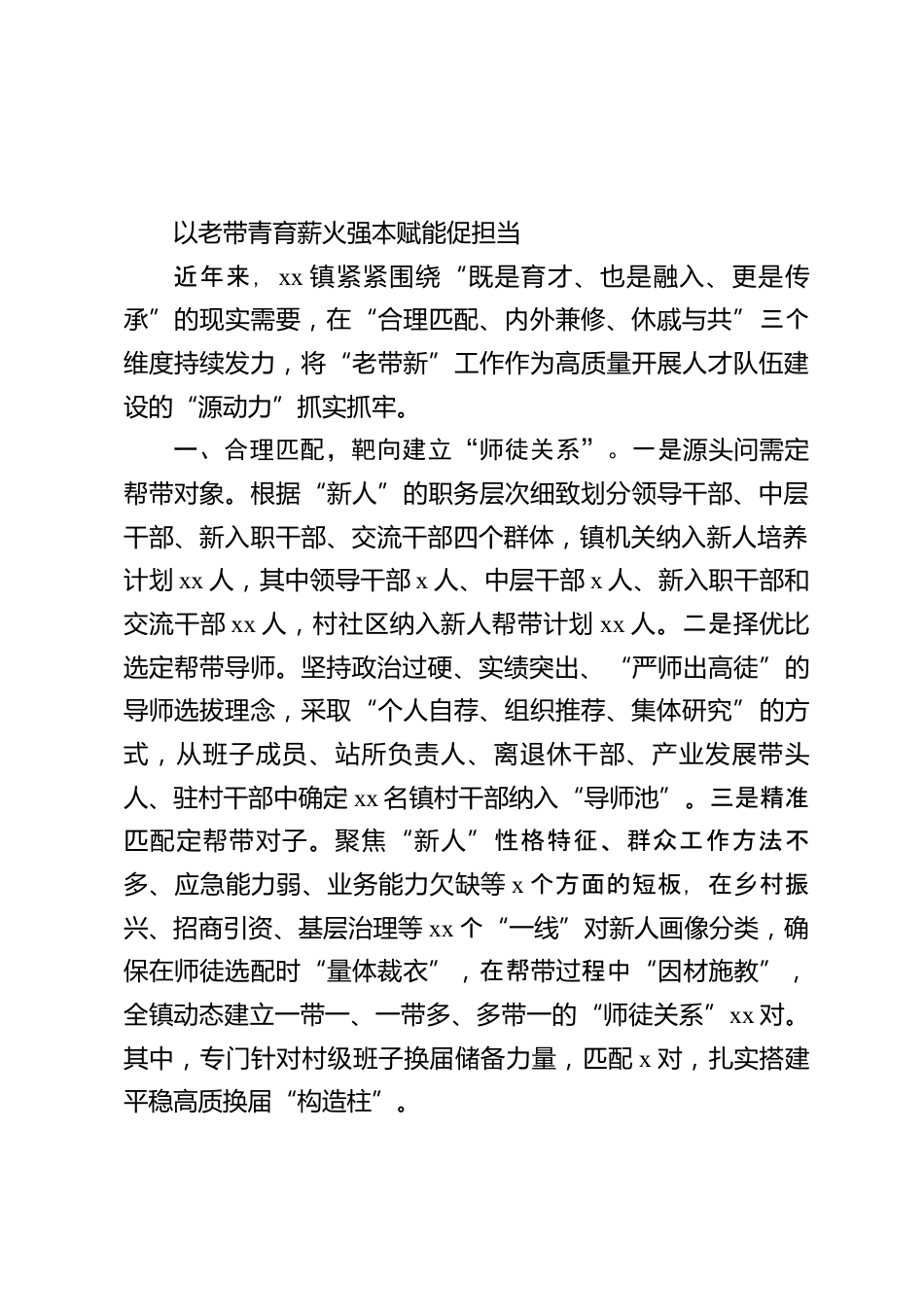 在全區(qū)組織工作會議上的交流發(fā)言材料匯編(5篇)目錄1.以老帶青育薪火強本賦能促擔(dān)當(dāng)22.黨建引領(lǐng)夯基礎(chǔ)富民增收促振興53.向中心聚焦為大局聚力推動組工信息宣傳再上新臺階84.黨建引領(lǐng)“爭一流”忠誠鑄魂“創(chuàng)滿意”115.引育并舉精管善用激活三農(nóng)人才“一池春水”14以老帶青育薪火強本賦能促擔(dān)當(dāng)近年來,xx鎮(zhèn)緊緊圍繞“既是育才、也是融入、更是傳承”的現(xiàn)實需要,在“合理匹配、內(nèi)外兼修、休戚與共”三個維度持續(xù)發(fā)力,將“老帶新”工作作為高質(zhì)量開展人才隊伍建設(shè)的“源動力”抓實抓牢。一、合理匹配,靶向建立“師徒關(guān)系”。一是源頭問需定幫帶對象。根據(jù)“新人”的職務(wù)...
