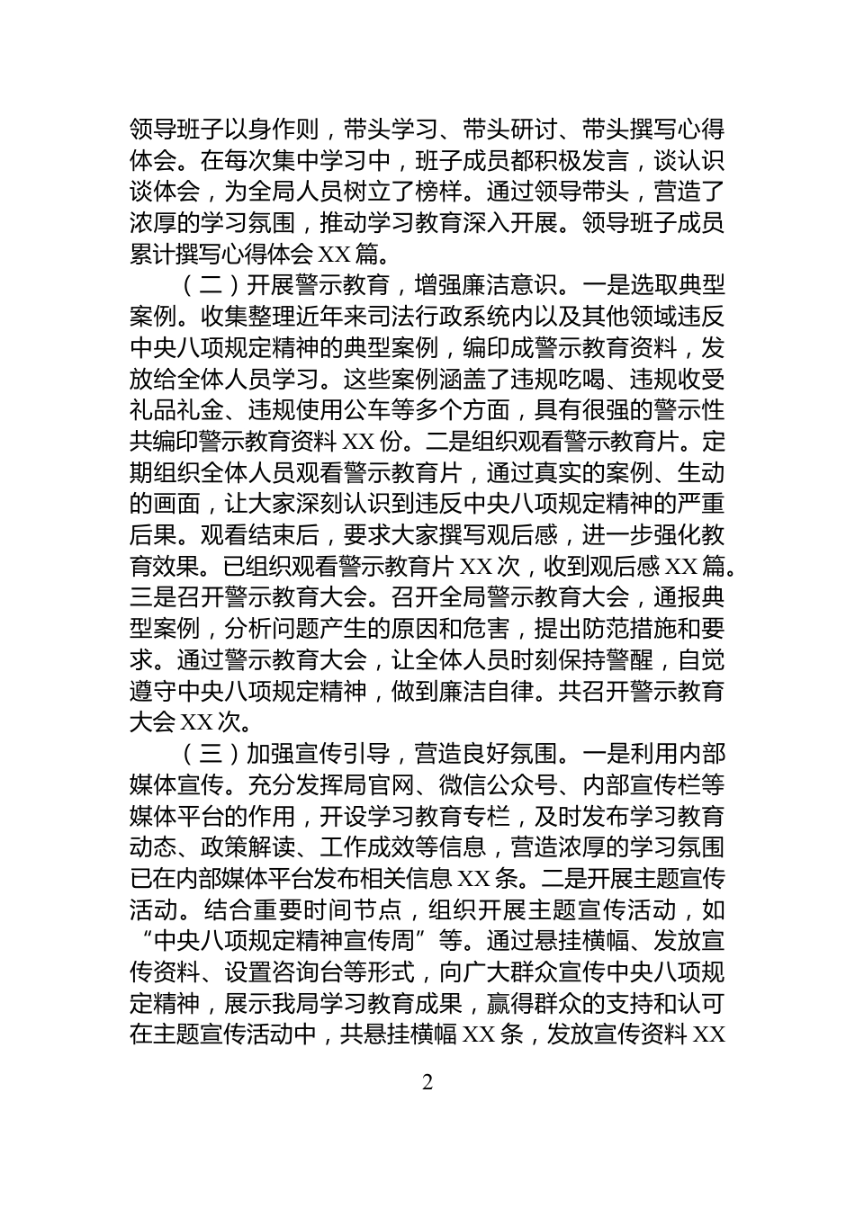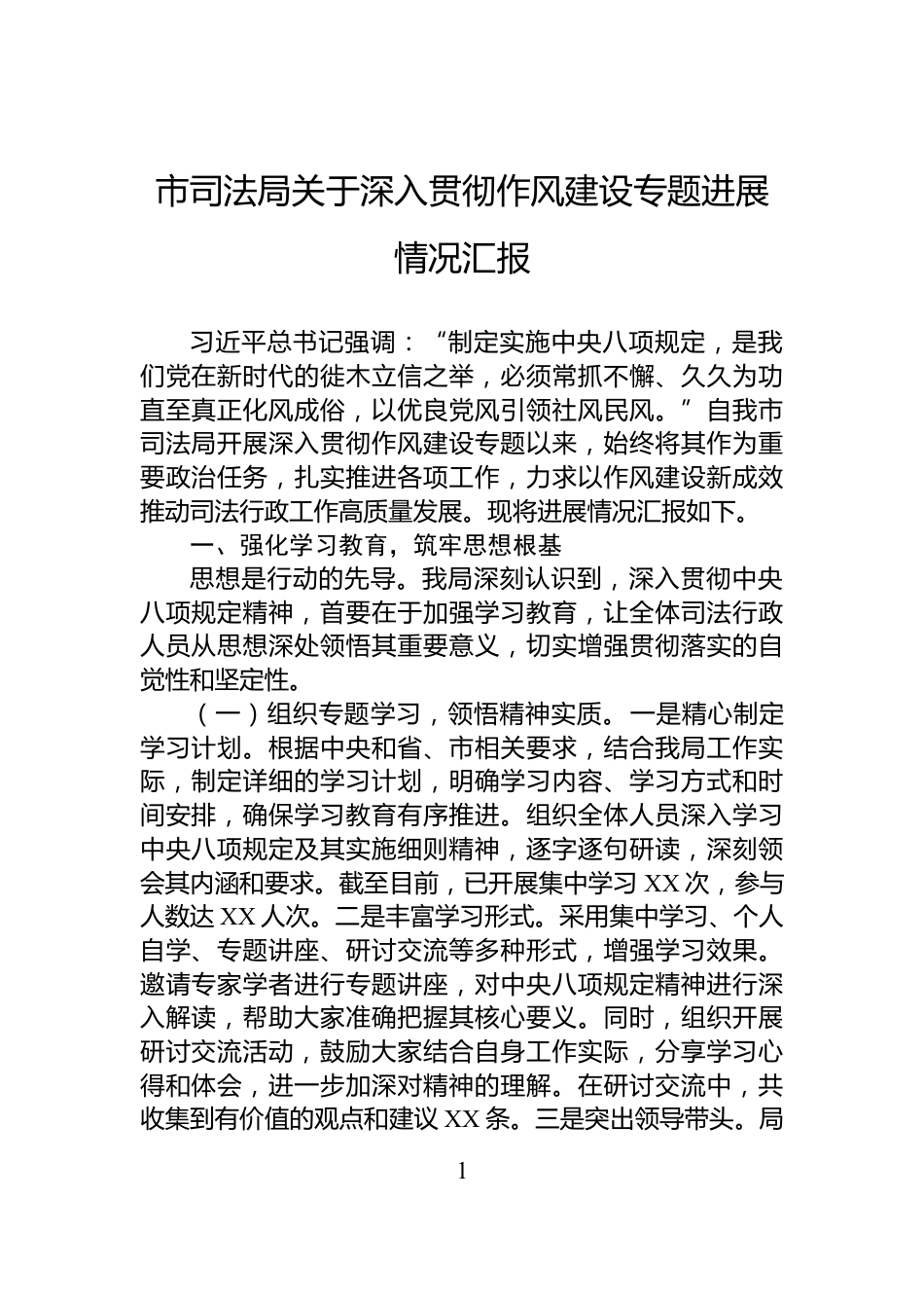 市司法局關(guān)于深入貫徹作風(fēng)建設(shè)專題進(jìn)展情況匯報習(xí)近平總書記強調(diào):“制定實施中央八項規(guī)定,是我們黨在新時代的徙木立信之舉,必須常抓不懈、久久為功直至真正化風(fēng)成俗,以優(yōu)良黨風(fēng)引領(lǐng)社風(fēng)民風(fēng)?!弊晕沂兴痉ň珠_展深入貫徹作風(fēng)建設(shè)專題以來,始終將其作為重要政治任務(wù),扎實推進(jìn)各項工作,力求以作風(fēng)建設(shè)新成效推動司法行政工作高質(zhì)量發(fā)展?,F(xiàn)將進(jìn)展情況匯報如下。一、強化學(xué)習(xí)教育,筑牢思想根基思想是行動的先導(dǎo)。我局深刻認(rèn)識到,深入貫徹中央八項規(guī)定精神,首要在于加強學(xué)習(xí)教育,讓全體司法行政人員從思想深處領(lǐng)悟其重要意義,切實增強貫徹落實的自覺性和堅定性。...