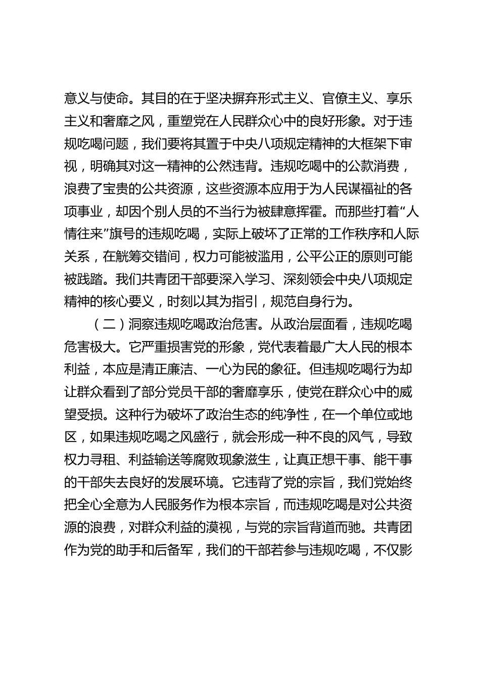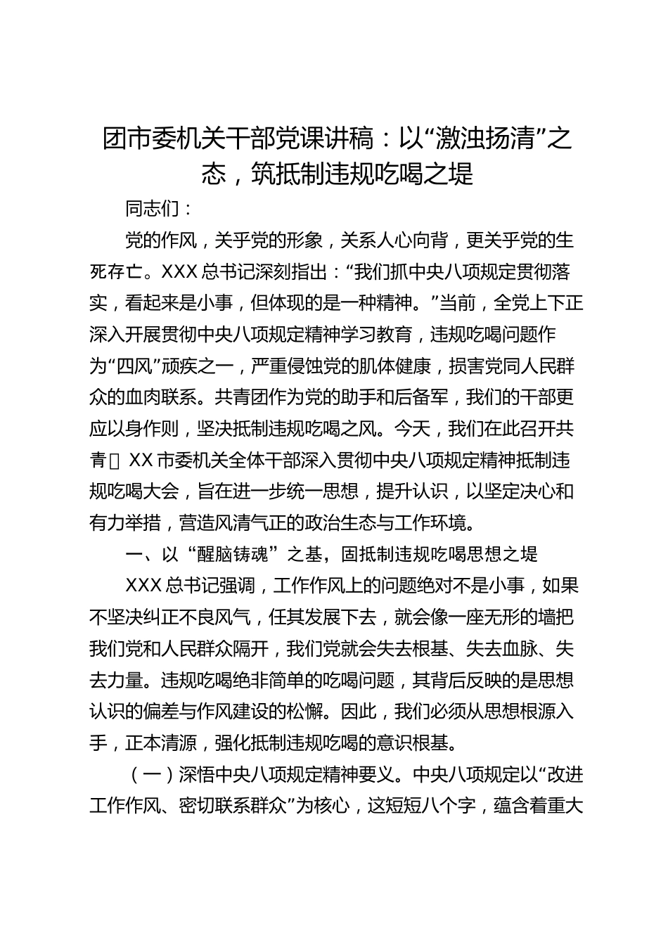 “”團(tuán)市委機(jī)關(guān)干部黨課講稿:以激濁揚(yáng)清之態(tài),筑抵制違規(guī)吃喝之堤同志們:黨的作風(fēng),關(guān)乎黨的形象,關(guān)系人心向背,更關(guān)乎黨的生死存亡。XXX“總書記深刻指出:我們抓中央八項(xiàng)規(guī)定貫徹落”實(shí),看起來是小事,但體現(xiàn)的是一種精神。當(dāng)前,全黨上下正深入開展貫徹中央八項(xiàng)規(guī)定精神學(xué)習(xí)教育,違規(guī)吃喝問題作“”為四風(fēng)頑疾之一,嚴(yán)重侵蝕黨的肌體健康,損害黨同人民群眾的血肉聯(lián)系。共青團(tuán)作為黨的助手和后備軍,我們的干部更應(yīng)以身作則,堅(jiān)決抵制違規(guī)吃喝之風(fēng)。今天,我們在此召開共青團(tuán)XX市委機(jī)關(guān)全體干部深入貫徹中央八項(xiàng)規(guī)定精神抵制違規(guī)吃喝大會(huì),旨在進(jìn)一步統(tǒng)一思想,...