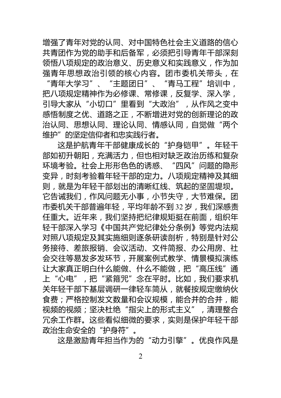 團(tuán)市委書記在全市年輕干部代表深入貫徹作風(fēng)建設(shè)專題座談會上的發(fā)言尊敬的某某書記,各位領(lǐng)導(dǎo),同志們:非常榮幸能代表共青團(tuán)某某市委,在這個凝聚共識、激發(fā)干勁的重要座談會上發(fā)言。昨天聆聽了某某書記立意高遠(yuǎn)、語重心長的重要講話,深受教育,倍受鼓舞。某某書記的講話,既是對中央八項規(guī)定精神精髓要義的深刻闡釋,也是對全市年輕干部錘煉作風(fēng)、擔(dān)當(dāng)作為的殷切期望和政治囑托,為我們共青團(tuán)組織引領(lǐng)廣大青年干部扣好廉潔從政“第一粒扣子”、投身某某高質(zhì)量發(fā)展指明了方向注入了強(qiáng)大動力。下面,我結(jié)合共青團(tuán)工作實(shí)際和團(tuán)市委機(jī)關(guān)年輕干部學(xué)習(xí)教育的實(shí)踐,談幾點(diǎn)認(rèn)識...