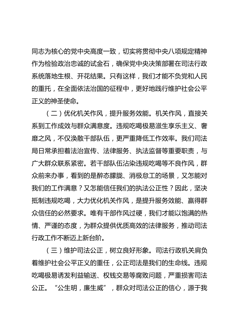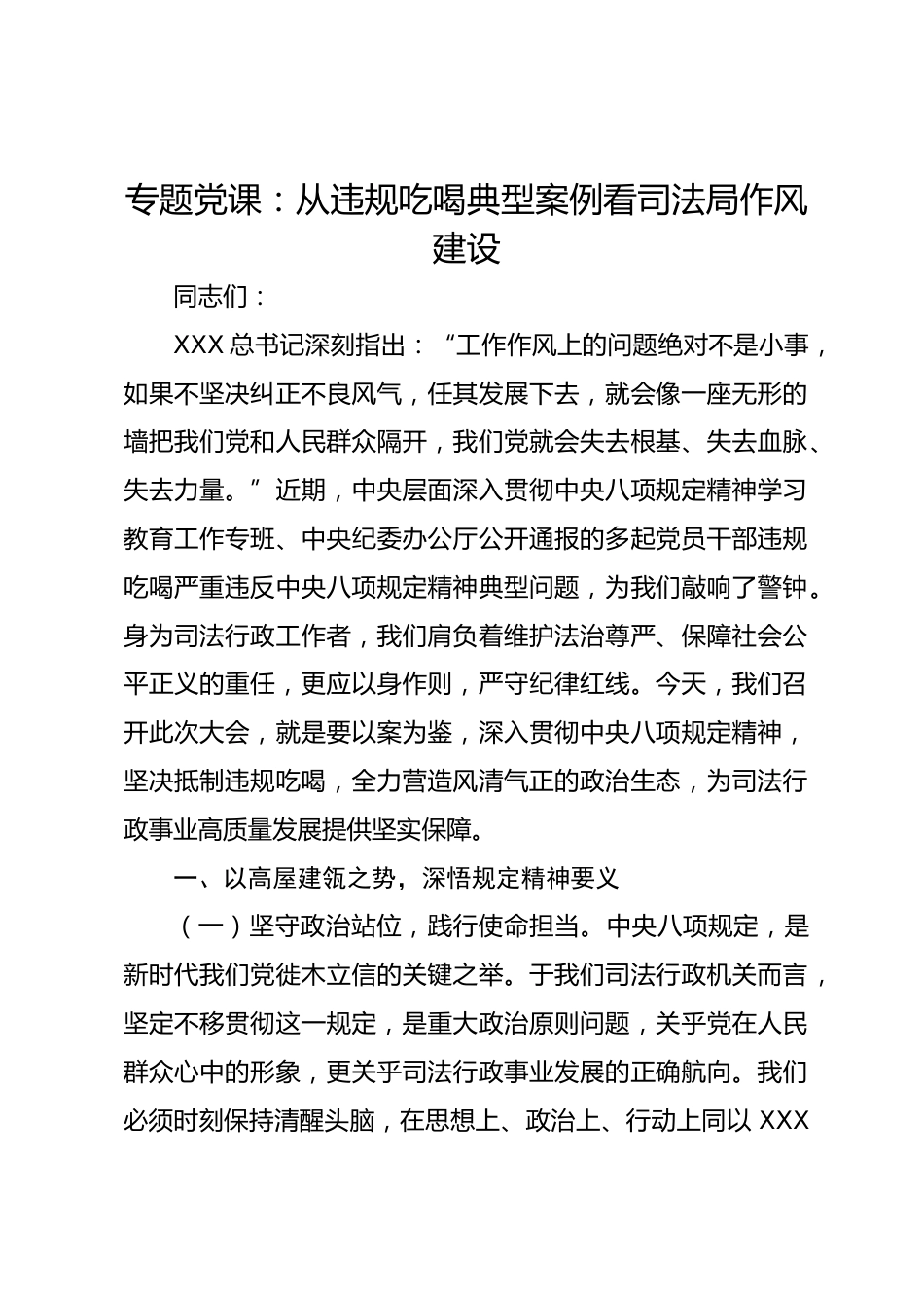 專題黨課:從違規(guī)吃喝典型案例看司法局作風(fēng)建設(shè)同志們:XXX總書(shū)記深刻指出:“工作作風(fēng)上的問(wèn)題絕對(duì)不是小事,如果不堅(jiān)決糾正不良風(fēng)氣,任其發(fā)展下去,就會(huì)像一座無(wú)形的墻把我們黨和人民群眾隔開(kāi),我們黨就會(huì)失去根基、失去血脈、失去力量?!苯冢醒雽用嫔钊胴瀼刂醒氚隧?xiàng)規(guī)定精神學(xué)習(xí)教育工作專班、中央紀(jì)委辦公廳公開(kāi)通報(bào)的多起黨員干部違規(guī)吃喝嚴(yán)重違反中央八項(xiàng)規(guī)定精神典型問(wèn)題,為我們敲響了警鐘。身為司法行政工作者,我們肩負(fù)著維護(hù)法治尊嚴(yán)、保障社會(huì)公平正義的重任,更應(yīng)以身作則,嚴(yán)守紀(jì)律紅線。今天,我們召開(kāi)此次大會(huì),就是要以案為鑒,深入貫徹中央八項(xiàng)...