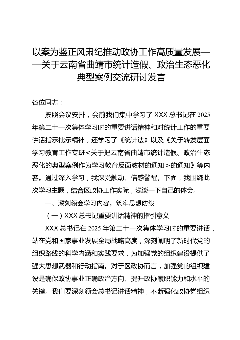 2025區(qū)政協(xié)黨組書(shū)記2025年云南省曲靖市統(tǒng)計(jì)造假、政治生態(tài)惡化典型案例交流研討發(fā)言材料VIP免費(fèi)