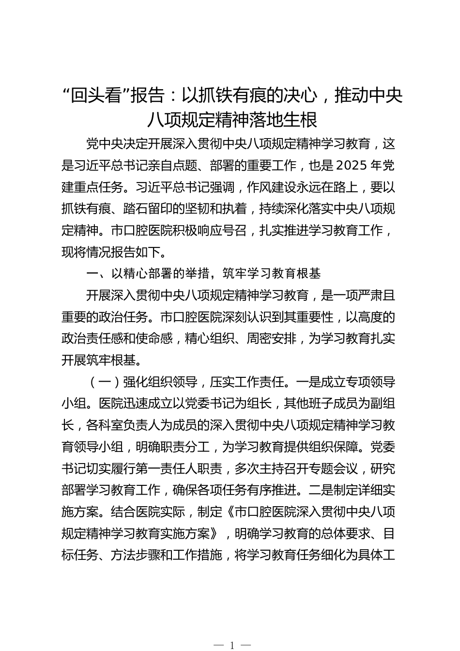 “”回頭看報(bào)告:以抓鐵有痕的決心,推動(dòng)中央八項(xiàng)規(guī)定精神落地生根黨中央決定開(kāi)展深入貫徹中央八項(xiàng)規(guī)定精神學(xué)習(xí)教育,這是習(xí)近平總書記親自點(diǎn)題、部署的重要工作,也是2025年黨建重點(diǎn)任務(wù)。習(xí)近平總書記強(qiáng)調(diào),作風(fēng)建設(shè)永遠(yuǎn)在路上,要以抓鐵有痕、踏石留印的堅(jiān)韌和執(zhí)著,持續(xù)深化落實(shí)中央八項(xiàng)規(guī)定精神。市口腔醫(yī)院積極響應(yīng)號(hào)召,扎實(shí)推進(jìn)學(xué)習(xí)教育工作,現(xiàn)將情況報(bào)告如下。一、以精心部署的舉措,筑牢學(xué)習(xí)教育根基開(kāi)展深入貫徹中央八項(xiàng)規(guī)定精神學(xué)習(xí)教育,是一項(xiàng)嚴(yán)肅且重要的政治任務(wù)。市口腔醫(yī)院深刻認(rèn)識(shí)到其重要性,以高度的政治責(zé)任感和使命感,精心組織、周密安排,為學(xué)...
