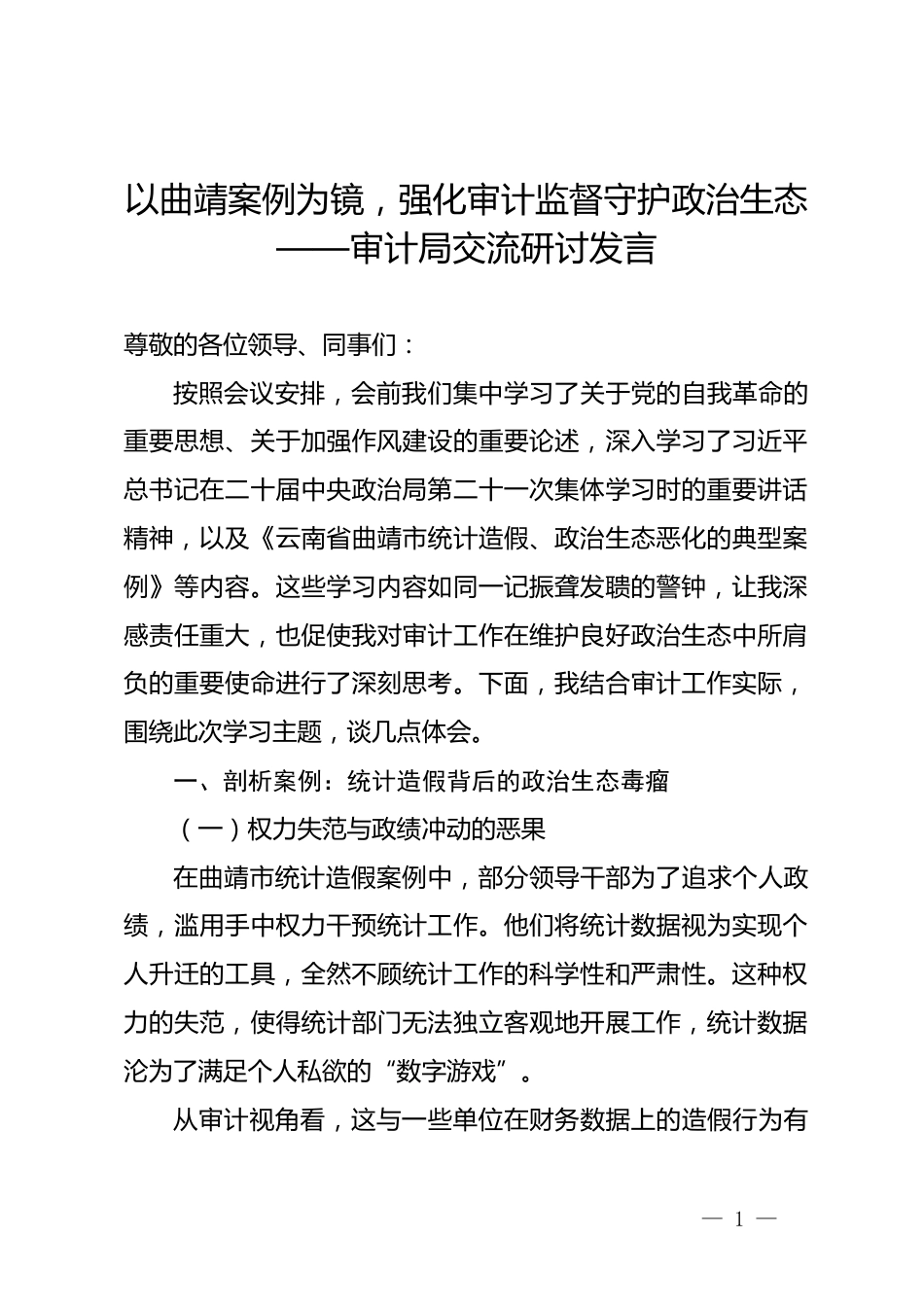 審計(jì)局2025年云南省曲靖市統(tǒng)計(jì)造假、政治生態(tài)惡化典型案例交流研討發(fā)言VIP免費(fèi)