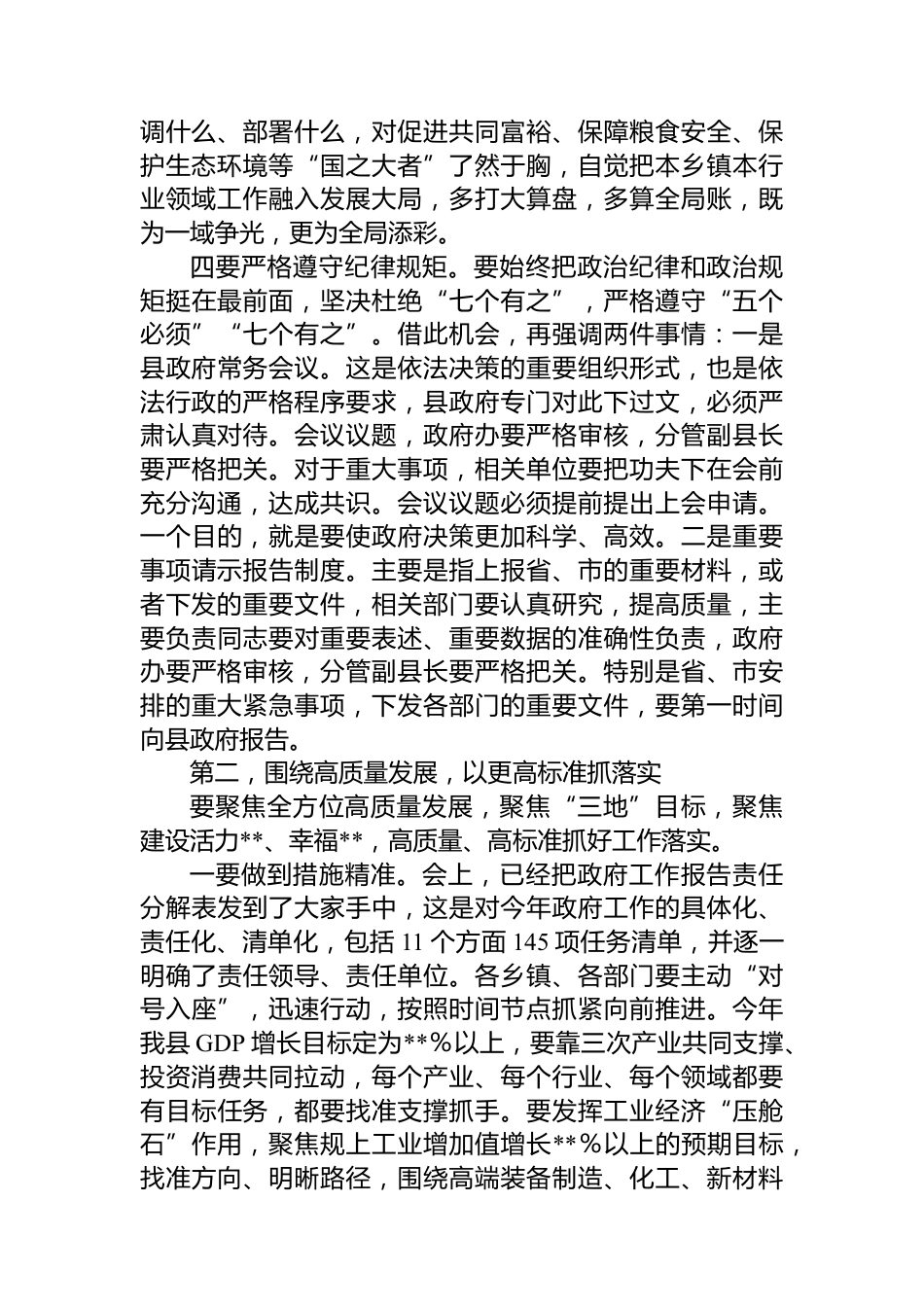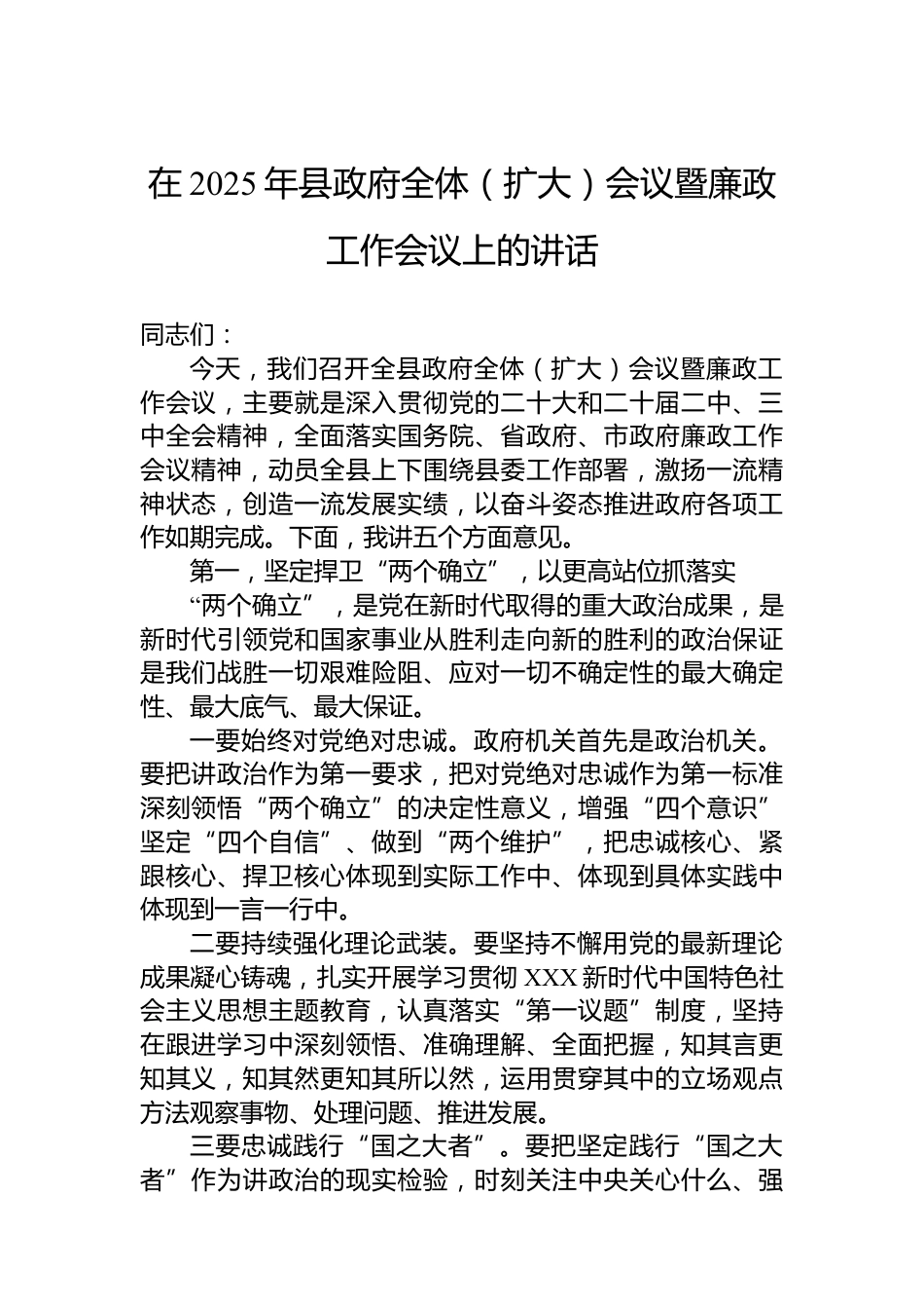 在2025年縣政府全體(擴(kuò)大)會(huì)議暨廉政工作會(huì)議上的講話同志們:今天,我們召開(kāi)全縣政府全體(擴(kuò)大)會(huì)議暨廉政工作會(huì)議,主要就是深入貫徹黨的二十大和二十屆二中、三中全會(huì)精神,全面落實(shí)國(guó)務(wù)院、省政府、市政府廉政工作會(huì)議精神,動(dòng)員全縣上下圍繞縣委工作部署,激揚(yáng)一流精神狀態(tài),創(chuàng)造一流發(fā)展實(shí)績(jī),以?shī)^斗姿態(tài)推進(jìn)政府各項(xiàng)工作如期完成。下面,我講五個(gè)方面意見(jiàn)。第一,堅(jiān)定捍衛(wèi)“兩個(gè)確立”,以更高站位抓落實(shí)“兩個(gè)確立”,是黨在新時(shí)代取得的重大政治成果,是新時(shí)代引領(lǐng)黨和國(guó)家事業(yè)從勝利走向新的勝利的政治保證是我們戰(zhàn)勝一切艱難險(xiǎn)阻、應(yīng)對(duì)一切不確定性的最大...