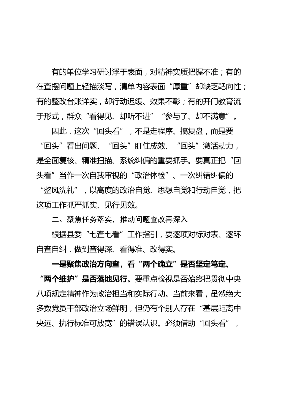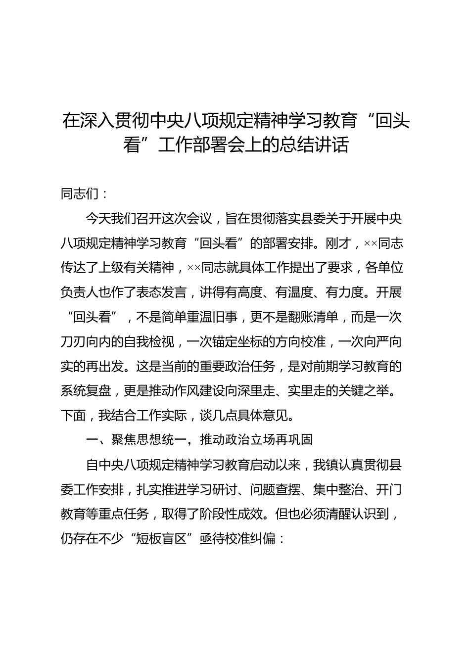 在深入貫徹中央八項(xiàng)規(guī)定精神學(xué)習(xí)教育“回頭看”工作部署會上的總結(jié)講話同志們:今天我們召開這次會議,旨在貫徹落實(shí)縣委關(guān)于開展中央八項(xiàng)規(guī)定精神學(xué)習(xí)教育“回頭看”的部署安排。剛才,××同志傳達(dá)了上級有關(guān)精神,××同志就具體工作提出了要求,各單位負(fù)責(zé)人也作了表態(tài)發(fā)言,講得有高度、有溫度、有力度。開展“回頭看”,不是簡單重溫舊事,更不是翻賬清單,而是一次刀刃向內(nèi)的自我檢視,一次錨定坐標(biāo)的方向校準(zhǔn),一次向嚴(yán)向?qū)嵉脑俪霭l(fā)。這是當(dāng)前的重要政治任務(wù),是對前期學(xué)習(xí)教育的系統(tǒng)復(fù)盤,更是推動作風(fēng)建設(shè)向深里走、實(shí)里走的關(guān)鍵之舉。下面,我結(jié)合工作實(shí)際,談...