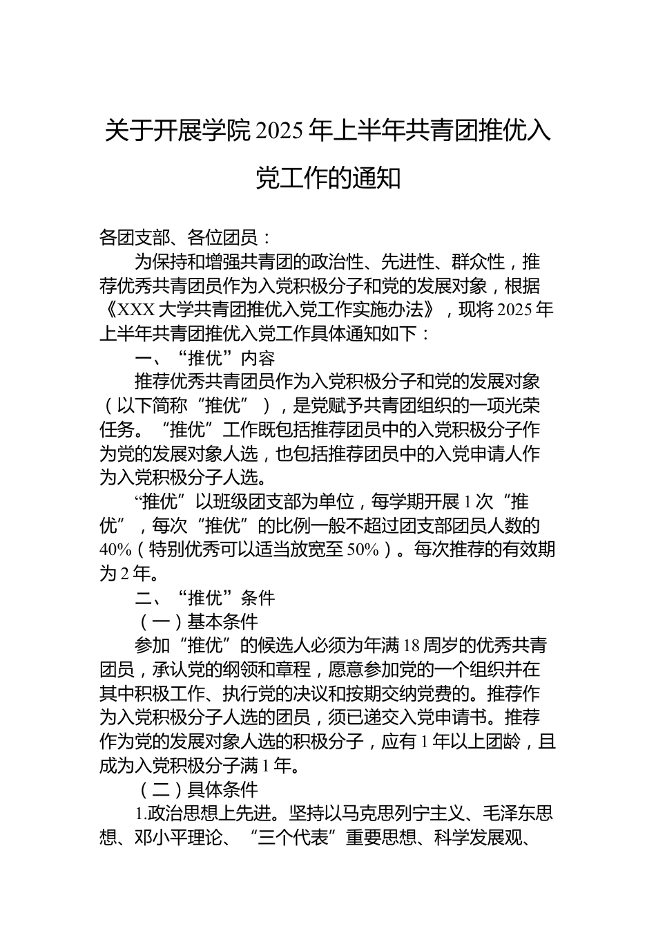 關于開展學院2025年上半年共青團推優(yōu)入黨工作的通知各團支部、各位團員:為保持和增強共青團的政治性、先進性、群眾性,推薦優(yōu)秀共青團員作為入黨積極分子和黨的發(fā)展對象,根據《XXX大學共青團推優(yōu)入黨工作實施辦法》,現(xiàn)將2025年上半年共青團推優(yōu)入黨工作具體通知如下:一、“推優(yōu)”內容推薦優(yōu)秀共青團員作為入黨積極分子和黨的發(fā)展對象(以下簡稱“推優(yōu)”),是黨賦予共青團組織的一項光榮任務。“推優(yōu)”工作既包括推薦團員中的入黨積極分子作為黨的發(fā)展對象人選,也包括推薦團員中的入黨申請人作為入黨積極分子人選?!巴苾?yōu)”以班級團支部為單位,每學期開展1次“推優(yōu)...