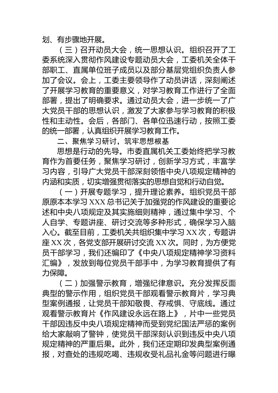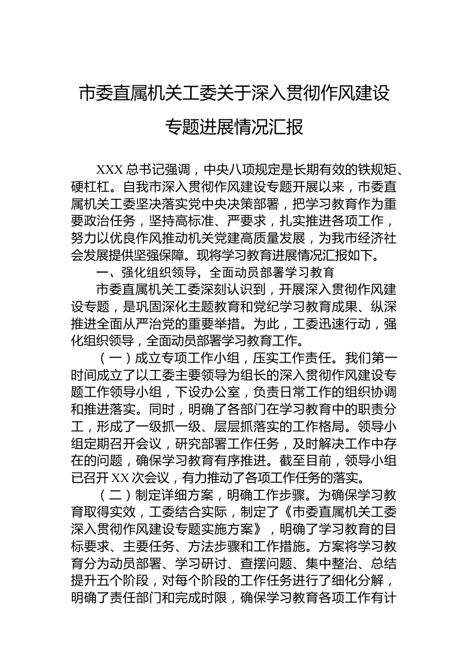 市委直屬機(jī)關(guān)工委關(guān)于深入貫徹作風(fēng)建設(shè)專題進(jìn)展情況匯報(bào)XXX總書記強(qiáng)調(diào),中央八項(xiàng)規(guī)定是長(zhǎng)期有效的鐵規(guī)矩、硬杠杠。自我市深入貫徹作風(fēng)建設(shè)專題開展以來(lái),市委直屬機(jī)關(guān)工委堅(jiān)決落實(shí)黨中央決策部署,把學(xué)習(xí)教育作為重要政治任務(wù),堅(jiān)持高標(biāo)準(zhǔn)、嚴(yán)要求,扎實(shí)推進(jìn)各項(xiàng)工作,努力以優(yōu)良作風(fēng)推動(dòng)機(jī)關(guān)黨建高質(zhì)量發(fā)展,為我市經(jīng)濟(jì)社會(huì)發(fā)展提供堅(jiān)強(qiáng)保障?,F(xiàn)將學(xué)習(xí)教育進(jìn)展情況匯報(bào)如下。一、強(qiáng)化組織領(lǐng)導(dǎo),全面動(dòng)員部署學(xué)習(xí)教育市委直屬機(jī)關(guān)工委深刻認(rèn)識(shí)到,開展深入貫徹作風(fēng)建設(shè)專題,是鞏固深化主題教育和黨紀(jì)學(xué)習(xí)教育成果、縱深推進(jìn)全面從嚴(yán)治黨的重要舉措。為此,工委迅速行動(dòng)...