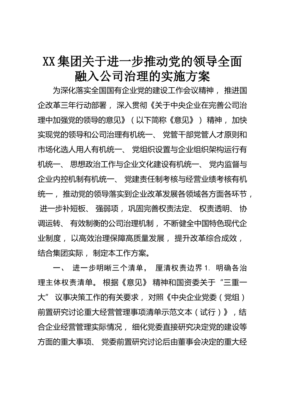 XX集團關(guān)于進一步推動黨的領(lǐng)導(dǎo)全面融入公司治理的實施方案VIP免費