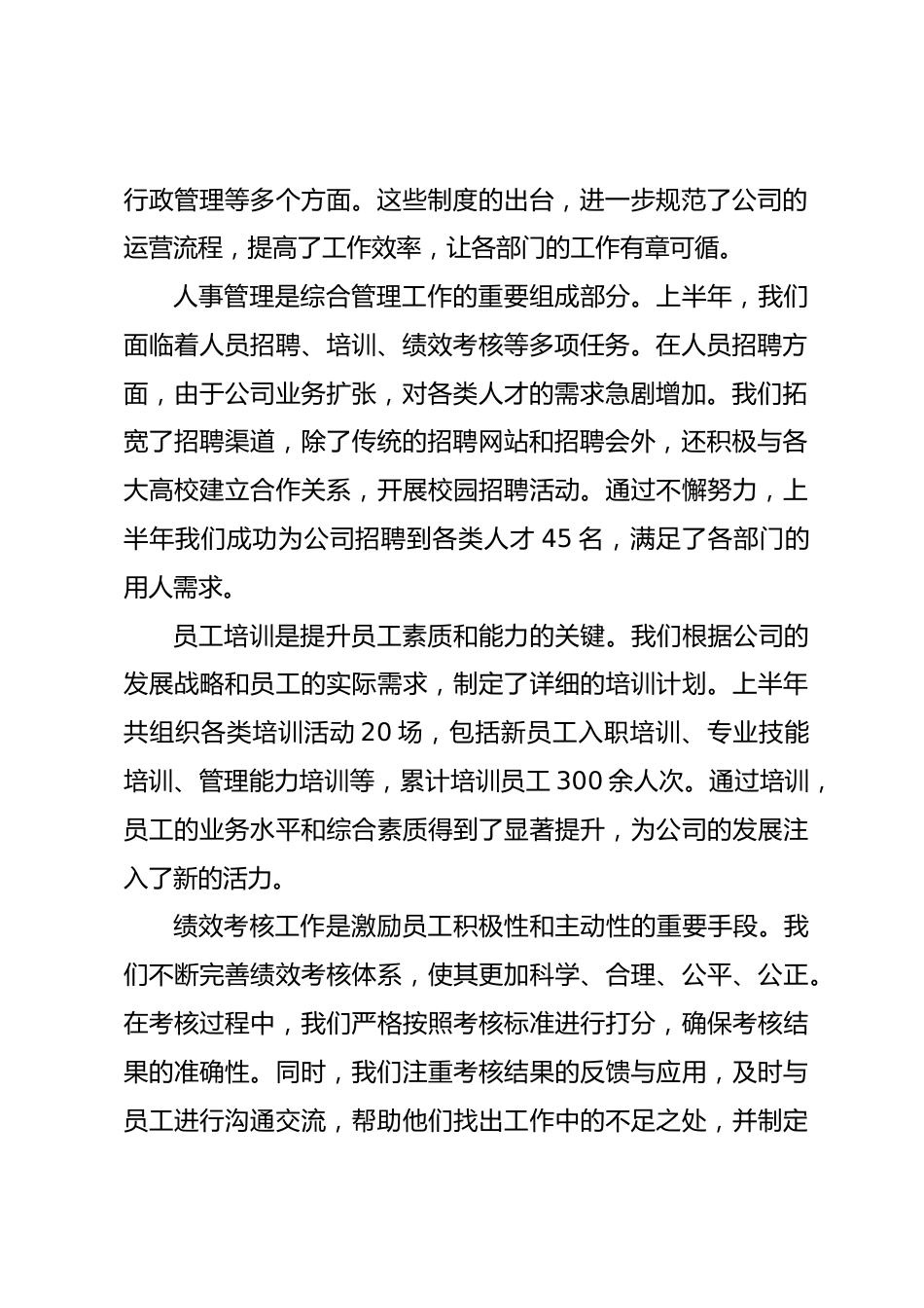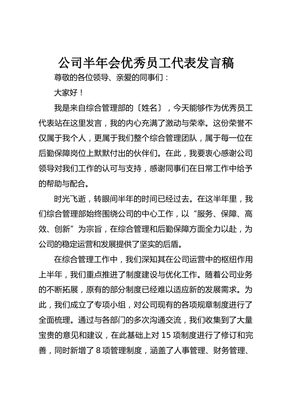 公司半年會(huì)優(yōu)秀員工代表發(fā)言稿尊敬的各位領(lǐng)導(dǎo)、親愛(ài)的同事們:大家好!我是來(lái)自綜合管理部的〔姓名〕,今天能夠作為優(yōu)秀員工代表站在這里發(fā)言,我的內(nèi)心充滿(mǎn)了激動(dòng)與榮幸。這份榮譽(yù)不僅屬于我個(gè)人,更屬于我們整個(gè)綜合管理團(tuán)隊(duì),屬于每一位在后勤保障崗位上默默付出的伙伴們。在此,我要衷心感謝公司領(lǐng)導(dǎo)對(duì)我們工作的認(rèn)可與支持,感謝同事們?cè)谌粘9ぷ髦薪o予的幫助與配合。時(shí)光飛逝,轉(zhuǎn)眼間半年的時(shí)間已經(jīng)過(guò)去。在這半年里,我們綜合管理部始終圍繞公司的中心工作,以“服務(wù)、保障、高效、創(chuàng)新”為宗旨,在綜合管理和后勤保障方面全力以赴,為公司的穩(wěn)定運(yùn)營(yíng)和發(fā)展提供了...