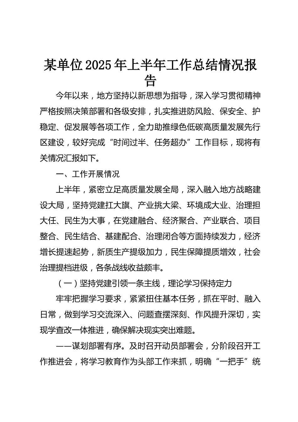 某單位2025年上半年工作總結(jié)情況報(bào)告今年以來(lái),地方堅(jiān)持以新思想為指導(dǎo),深入學(xué)習(xí)貫徹精神嚴(yán)格按照決策部署和各級(jí)安排,扎實(shí)推進(jìn)防風(fēng)險(xiǎn)、保安全、護(hù)穩(wěn)定、促發(fā)展等各項(xiàng)工作,全力助推綠色低碳高質(zhì)量發(fā)展先行區(qū)建設(shè),較好完成“時(shí)間過(guò)半、任務(wù)超辦”工作目標(biāo),現(xiàn)將有關(guān)情況匯報(bào)如下。一、工作開(kāi)展情況上半年,緊密立足高質(zhì)量發(fā)展全局,深入融入地方戰(zhàn)略建設(shè)大局,堅(jiān)持黨建扛大旗、產(chǎn)業(yè)挑大梁、環(huán)境成大業(yè)、治理?yè)?dān)大任、民生為大事,在黨建融合、經(jīng)濟(jì)聚合、產(chǎn)業(yè)聯(lián)合、項(xiàng)目整合、民生結(jié)合、基建配合、治理閉合等方面持續(xù)發(fā)力,經(jīng)濟(jì)增長(zhǎng)提速起勢(shì),新質(zhì)生產(chǎn)提級(jí)加力,民生保障...