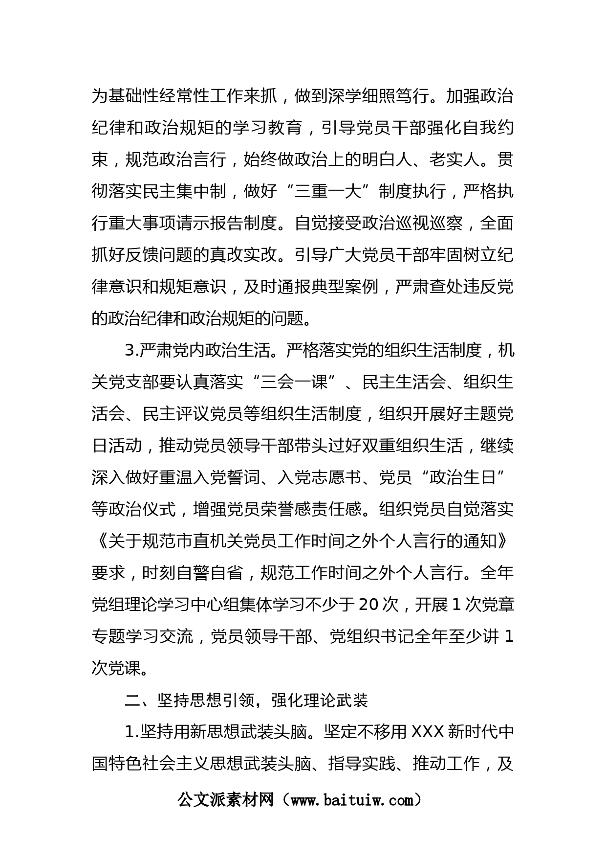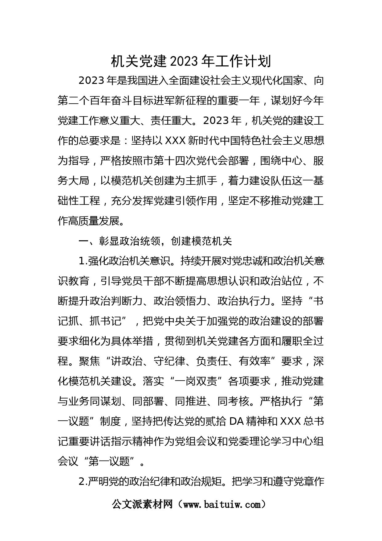 機(jī)關(guān)黨建2023年工作計(jì)劃2023年是我國進(jìn)入全面建設(shè)社會(huì)主義現(xiàn)代化國家、向第二個(gè)百年奮斗目標(biāo)進(jìn)軍新征程的重要一年,謀劃好今年黨建工作意義重大、責(zé)任重大。2023年,機(jī)關(guān)黨的建設(shè)工作的總要求是:堅(jiān)持以XXX新時(shí)代中國特色社會(huì)主義思想為指導(dǎo),嚴(yán)格按照市第十四次黨代會(huì)部署,圍繞中心、服務(wù)大局,以模范機(jī)關(guān)創(chuàng)建為主抓手,著力建設(shè)隊(duì)伍這一基礎(chǔ)性工程,充分發(fā)揮黨建引領(lǐng)作用,堅(jiān)定不移推動(dòng)黨建工作高質(zhì)量發(fā)展。一、彰顯政治統(tǒng)領(lǐng),創(chuàng)建模范機(jī)關(guān)1.強(qiáng)化政治機(jī)關(guān)意識(shí)。持續(xù)開展對黨忠誠和政治機(jī)關(guān)意識(shí)教育,引導(dǎo)黨員干部不斷提高思想認(rèn)識(shí)和政治站位,不斷提升政治判斷力、政...