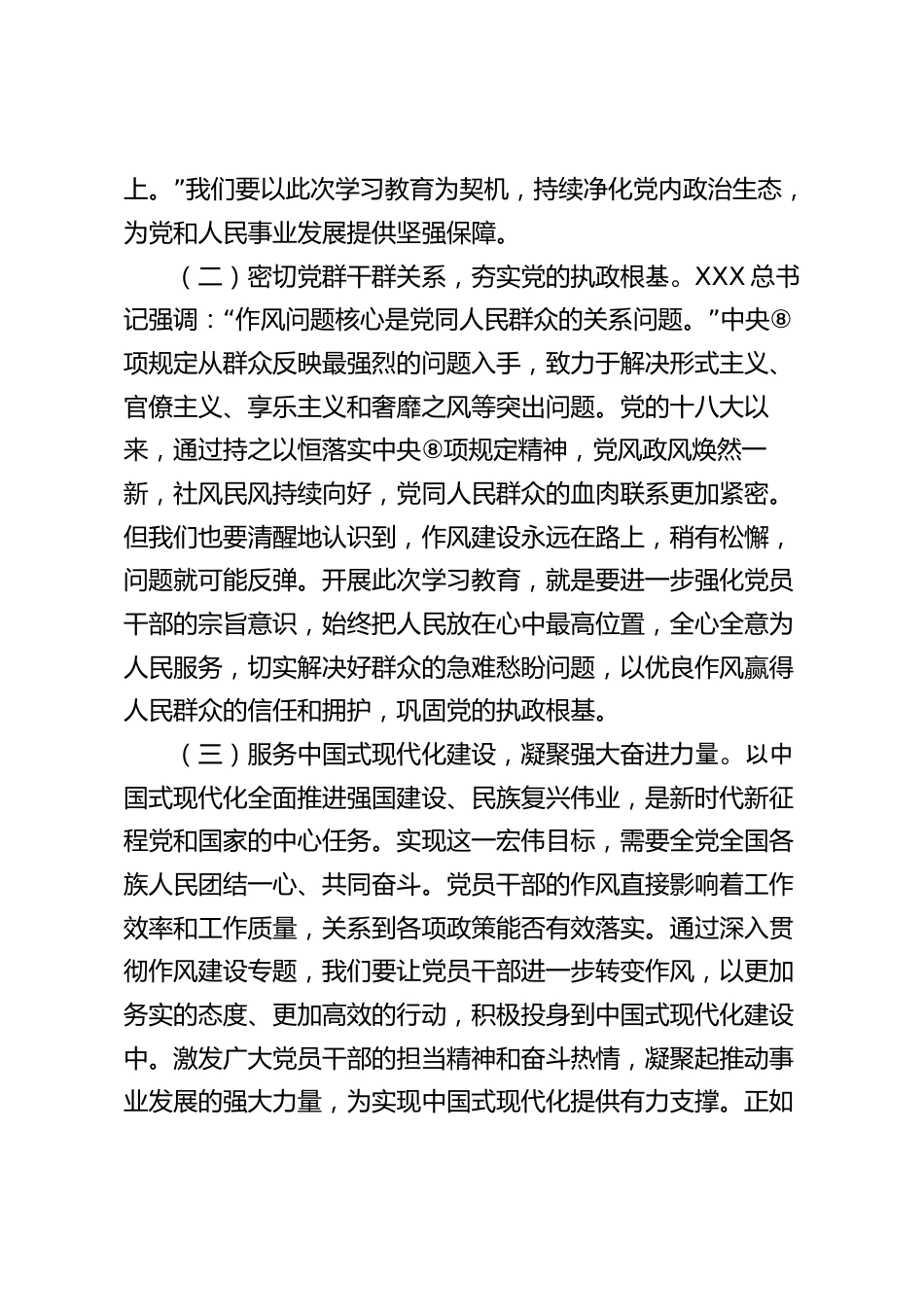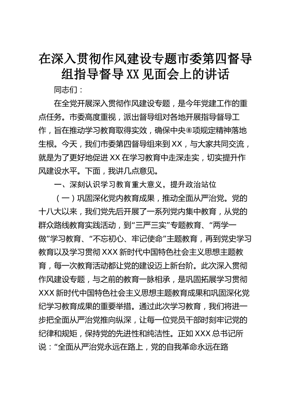 在深入貫徹作風(fēng)建設(shè)專題市委第四督導(dǎo)組指導(dǎo)督導(dǎo)XX見面會上的講話同志們:在全黨開展深入貫徹作風(fēng)建設(shè)專題,是今年黨建工作的重點(diǎn)任務(wù)。市委高度重視,派出督導(dǎo)組對各地開展指導(dǎo)督導(dǎo)工作,旨在推動(dòng)學(xué)習(xí)教育取得實(shí)效,確保中央⑧項(xiàng)規(guī)定精神落地生根。今天,我們市委第四督導(dǎo)組來到XX,與大家共同交流,就是為了更好地促進(jìn)XX在學(xué)習(xí)教育中走深走實(shí),切實(shí)提升作風(fēng)建設(shè)水平。下面,我講幾點(diǎn)意見。一、深刻認(rèn)識學(xué)習(xí)教育重大意義,提升政治站位(一)鞏固深化黨內(nèi)教育成果,推動(dòng)全面從嚴(yán)治黨。黨的十八大以來,我們黨先后開展了一系列黨內(nèi)集中教育,從黨的“”“群眾路線教育實(shí)踐...