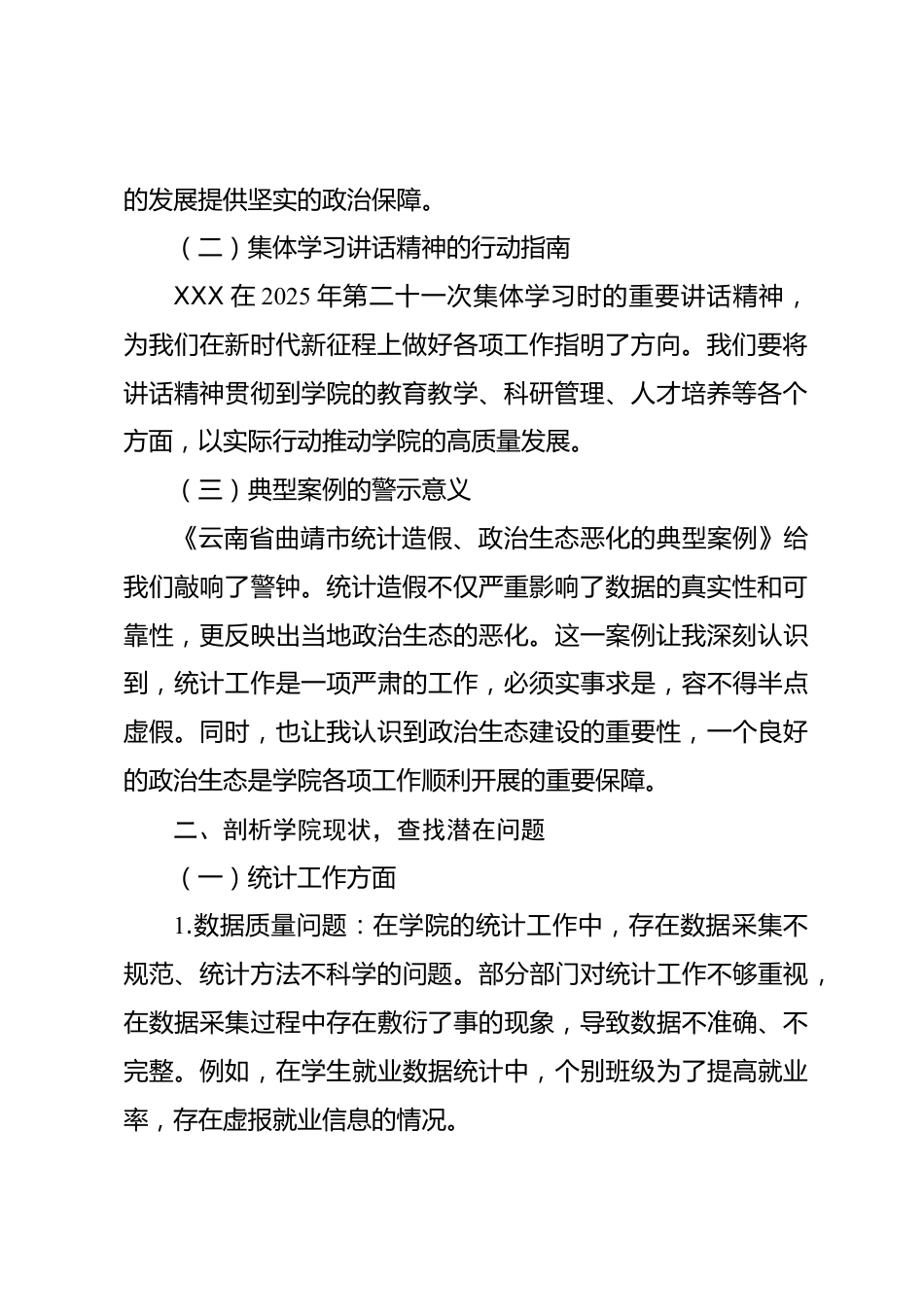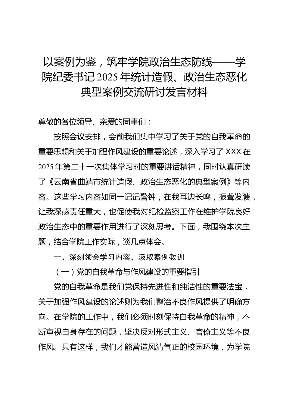 以案例為鑒,筑牢學(xué)院政治生態(tài)防線——學(xué)院紀(jì)委書記2025年統(tǒng)計(jì)造假、政治生態(tài)惡化典型案例交流研討發(fā)言材料尊敬的各位領(lǐng)導(dǎo)、親愛的同事們:按照會(huì)議安排,會(huì)前我們集中學(xué)習(xí)了關(guān)于黨的自我革命的重要思想和關(guān)于加強(qiáng)作風(fēng)建設(shè)的重要論述,深入學(xué)習(xí)了XXX在2025年第二十一次集體學(xué)習(xí)時(shí)的重要講話精神,同時(shí)認(rèn)真研讀了《云南省曲靖市統(tǒng)計(jì)造假、政治生態(tài)惡化的典型案例》等內(nèi)容。這些學(xué)習(xí)內(nèi)容如同一記記警鐘,在我耳邊長鳴,振聾發(fā)聵,讓我深感責(zé)任重大,也促使我對(duì)紀(jì)檢監(jiān)察工作在維護(hù)學(xué)院良好政治生態(tài)中的重要作用進(jìn)行了深刻思考。下面,我圍繞本次主題,結(jié)合學(xué)院工作實(shí)際,談...