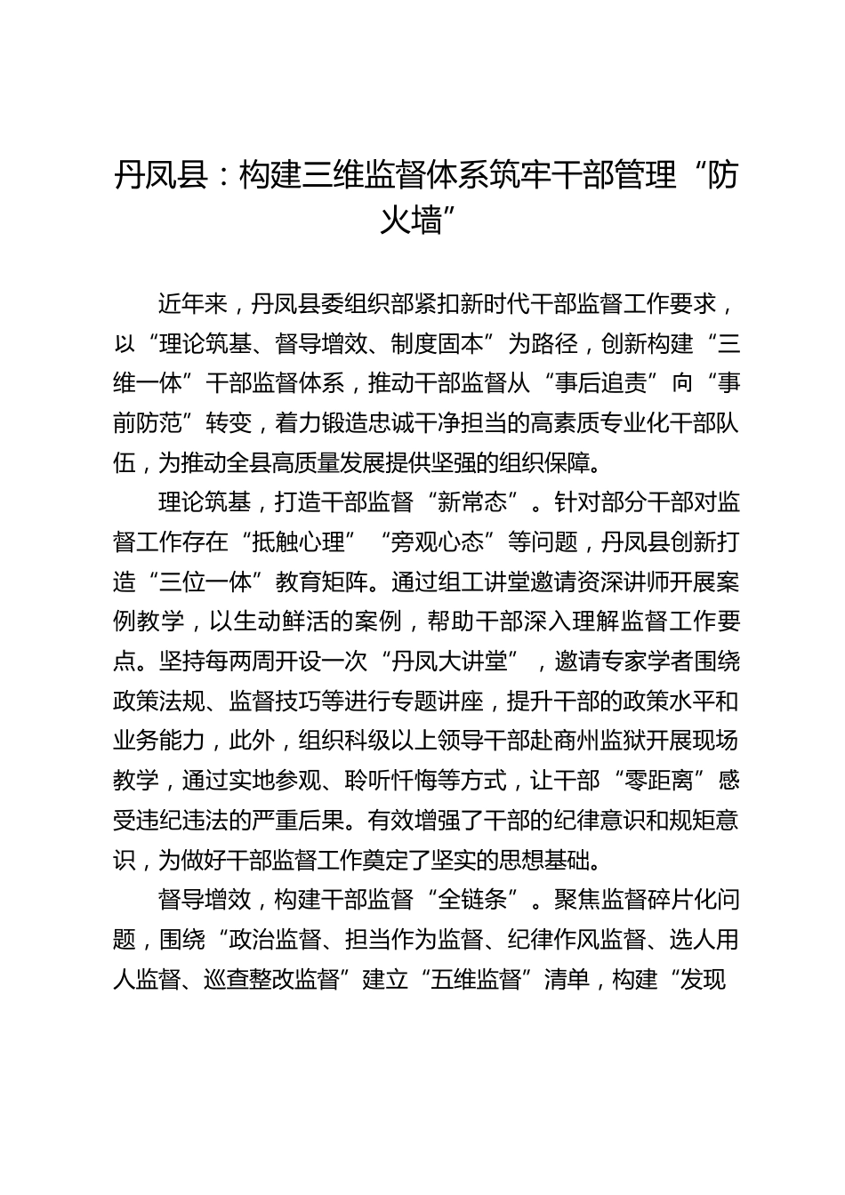 丹鳳縣:構(gòu)建三維監(jiān)督體系筑牢干部管理“防火墻”近年來,丹鳳縣委組織部緊扣新時(shí)代干部監(jiān)督工作要求,以“理論筑基、督導(dǎo)增效、制度固本”為路徑,創(chuàng)新構(gòu)建“三維一體”干部監(jiān)督體系,推動(dòng)干部監(jiān)督從“事后追責(zé)”向“事前防范”轉(zhuǎn)變,著力鍛造忠誠干凈擔(dān)當(dāng)?shù)母咚刭|(zhì)專業(yè)化干部隊(duì)伍,為推動(dòng)全縣高質(zhì)量發(fā)展提供堅(jiān)強(qiáng)的組織保障。理論筑基,打造干部監(jiān)督“新常態(tài)”。針對部分干部對監(jiān)督工作存在“抵觸心理”“旁觀心態(tài)”等問題,丹鳳縣創(chuàng)新打造“三位一體”教育矩陣。通過組工講堂邀請資深講師開展案例教學(xué),以生動(dòng)鮮活的案例,幫助干部深入理解監(jiān)督工作要點(diǎn)。堅(jiān)持每兩周開設(shè)...