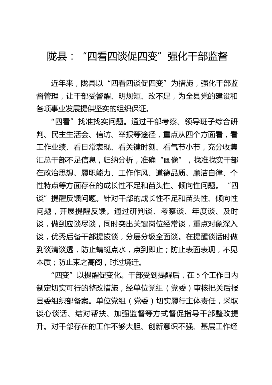 隴縣:“四看四談促四變”強化干部監(jiān)督近年來,隴縣以“四看四談促四變”為措施,強化干部監(jiān)督管理,讓干部受警醒、明規(guī)矩、改不足,為全縣黨的建設和各項事業(yè)發(fā)展提供堅實的組織保證。“四看”找準找實問題。通過干部考察、領導班子綜合研判、民主生活會、信訪、舉報等途徑,重點從四個方面看,看工作業(yè)績、看日常表現(xiàn)、看關(guān)鍵時刻、看氣節(jié)小節(jié),充分收集匯總干部不足信息,歸納分析,準確“畫像”,找準找實干部在政治思想、履職能力、工作作風、道德品質(zhì)、廉潔自律、個性特點等方面存在的成長性不足和苗頭性、傾向性問題。“四談”提醒反饋問題。針對干部的成長性不足...