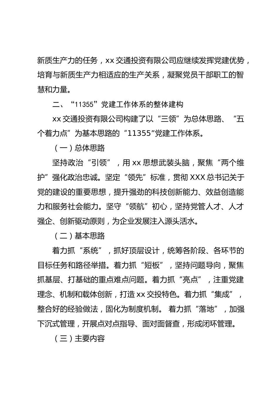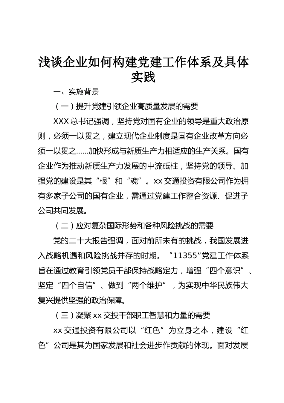 淺談企業(yè)如何構(gòu)建黨建工作體系及具體實(shí)踐一、實(shí)施背景(一)提升黨建引領(lǐng)企業(yè)高質(zhì)量發(fā)展的需要XXX總書記強(qiáng)調(diào),堅(jiān)持黨對國有企業(yè)的領(lǐng)導(dǎo)是重大政治原則,必須一以貫之,建立現(xiàn)代企業(yè)制度是國有企業(yè)改革方向必須一以貫之……加快形成與新質(zhì)生產(chǎn)力相適應(yīng)的生產(chǎn)關(guān)系。國有企業(yè)作為推動(dòng)新質(zhì)生產(chǎn)力發(fā)展的中流砥柱,堅(jiān)持黨的領(lǐng)導(dǎo)、加強(qiáng)黨的建設(shè)是其“根”和“魂”。xx交通投資有限公司作為擁有多家子公司的國有企業(yè),需通過黨建工作整合資源、促進(jìn)子公司共同發(fā)展。(二)應(yīng)對復(fù)雜國際形勢和各種風(fēng)險(xiǎn)挑戰(zhàn)的需要黨的二十大報(bào)告強(qiáng)調(diào),面對前所未有的挑戰(zhàn),我國發(fā)展進(jìn)入戰(zhàn)略機(jī)遇和風(fēng)...