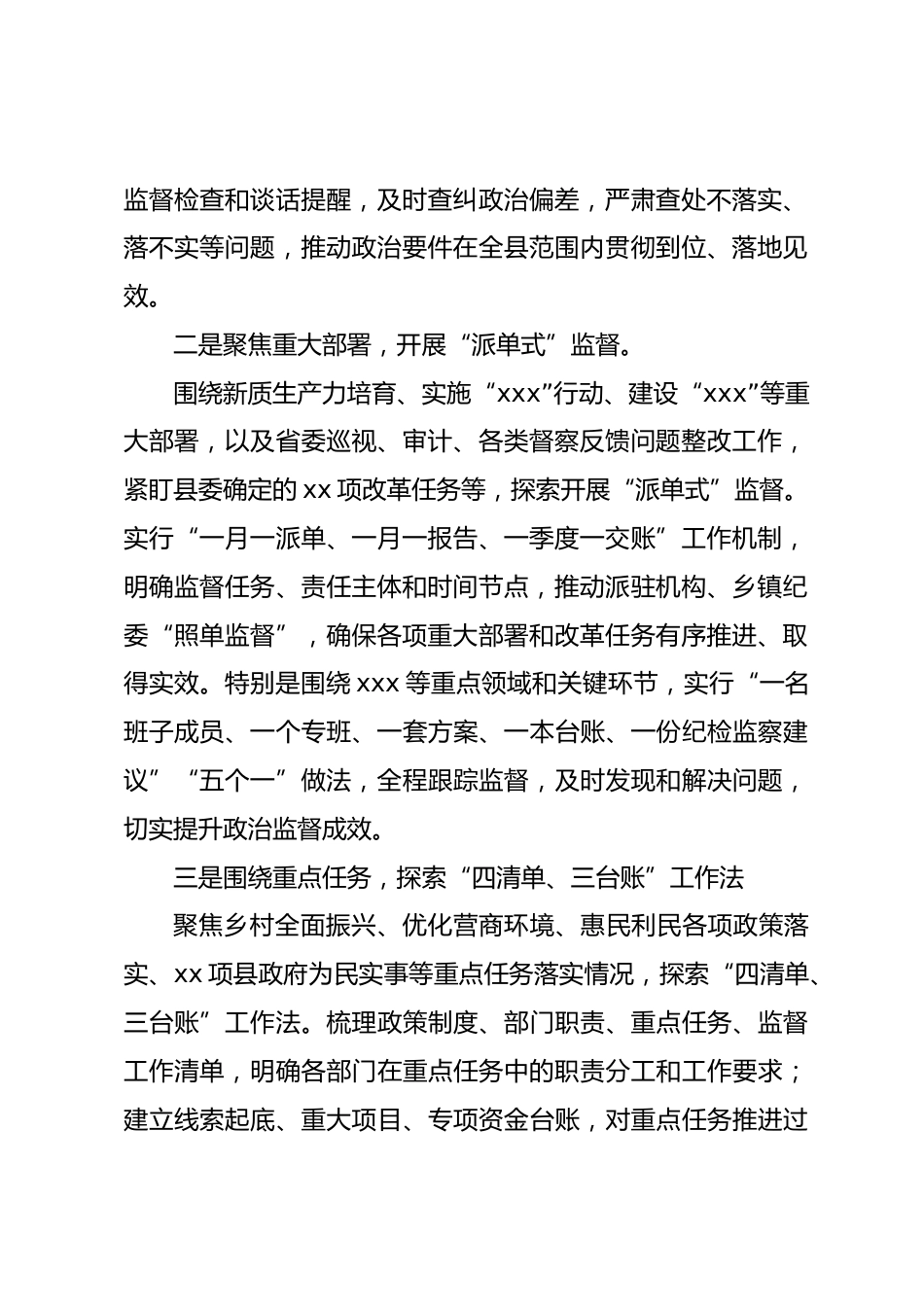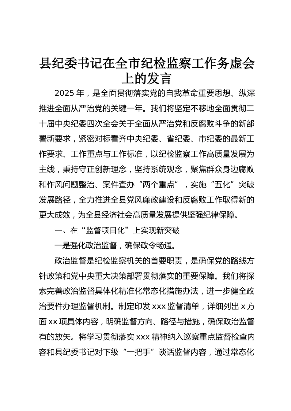 縣紀(jì)委書記在全市紀(jì)檢監(jiān)察工作務(wù)虛會上的發(fā)言2025年,是全面貫徹落實黨的自我革命重要思想、縱深推進(jìn)全面從嚴(yán)治黨的關(guān)鍵一年。我們將堅定不移地全面貫徹二十屆中央紀(jì)委四次全會關(guān)于全面從嚴(yán)治黨和反腐敗斗爭的新部署新要求,緊密對標(biāo)看齊中央紀(jì)委、省紀(jì)委、市紀(jì)委的最新工作要求、工作重點與工作標(biāo)準(zhǔn),以紀(jì)檢監(jiān)察工作高質(zhì)量發(fā)展為主線,秉持守正創(chuàng)新理念,堅持系統(tǒng)觀念,聚焦群眾身邊腐敗和作風(fēng)問題整治、案件查辦“兩個重點”,實施“五化”突破發(fā)展路徑,全力推進(jìn)全縣黨風(fēng)廉政建設(shè)和反腐敗工作取得新的更大成效,為全縣經(jīng)濟(jì)社會高質(zhì)量發(fā)展提供堅強(qiáng)紀(jì)律保障。一、在“監(jiān)...