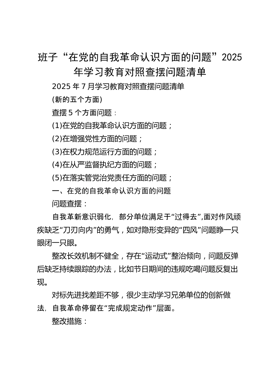班子“在黨的自我革命認(rèn)識方面的問題”2025年學(xué)習(xí)教育對照查擺問題清單(樣本)VIP免費(fèi)