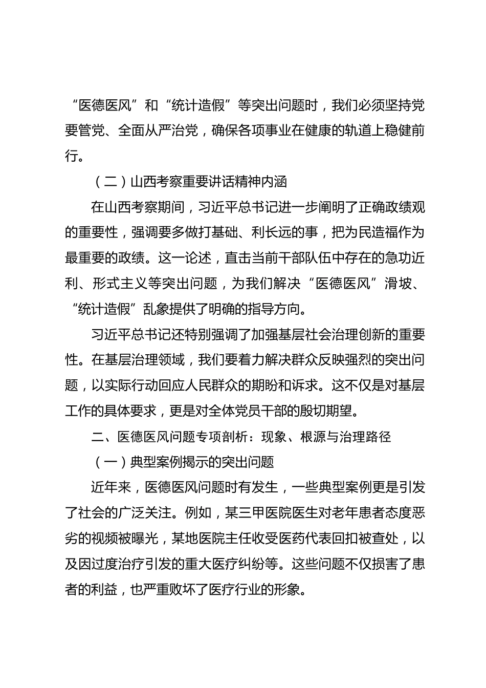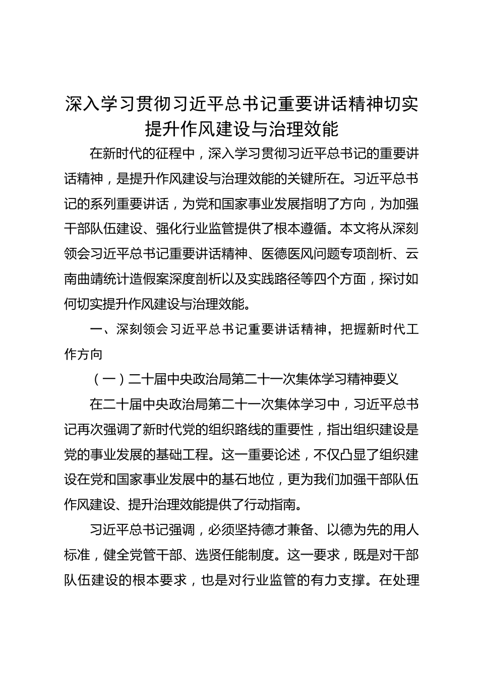 深入學習貫徹習近平總書記重要講話精神切實提升作風建設與治理效能在新時代的征程中,深入學習貫徹習近平總書記的重要講話精神,是提升作風建設與治理效能的關鍵所在。習近平總書記的系列重要講話,為黨和國家事業(yè)發(fā)展指明了方向,為加強干部隊伍建設、強化行業(yè)監(jiān)管提供了根本遵循。本文將從深刻領會習近平總書記重要講話精神、醫(yī)德醫(yī)風問題專項剖析、云南曲靖統計造假案深度剖析以及實踐路徑等四個方面,探討如何切實提升作風建設與治理效能。一、深刻領會習近平總書記重要講話精神,把握新時代工作方向(一)二十屆中央政治局第二十一次集體學習精神要義在二十屆中央政...