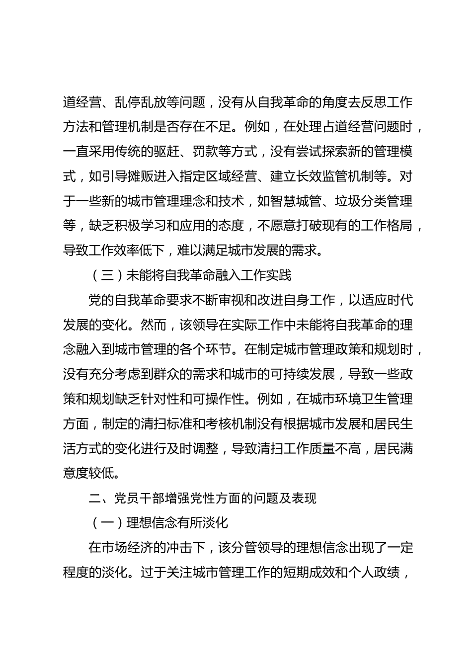 街道辦事處城管分管領導黨建相關問題剖析在全面從嚴治黨不斷推進的大背景下,基層街道辦事處的黨建工作至關重要。龍泉街道辦事處分管城市管理工作的領導,在黨的自我革命的認識、黨員干部增強黨性、權力規(guī)范運行、從嚴監(jiān)督執(zhí)紀、落實管黨治黨責任等方面存在著一些問題,這些問題不僅影響著城市管理工作的成效,也對黨的形象和基層黨組織的戰(zhàn)斗力產生了一定的負面影響。一、對黨的自我革命的認識問題及表現(一)理論學習不深入該分管領導對黨的自我革命理論的學習停于表面,缺乏深入鉆研。在參加上級組織的集中學習時,只是被動聽講,沒有主動思考理論與城市管理工作的結...