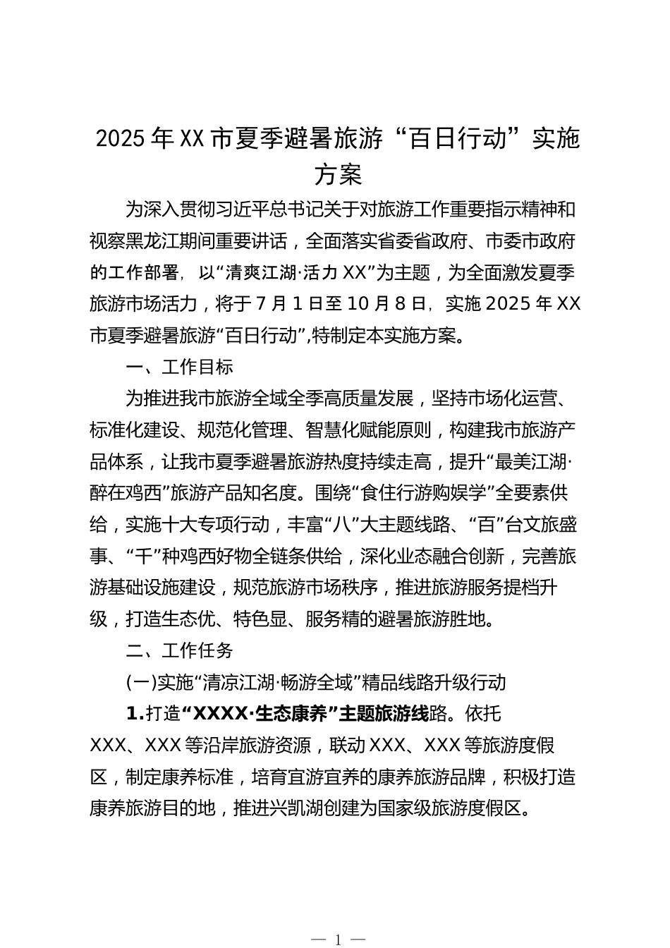 2025年XX市夏季避暑旅游“百日行動”實施方案為深入貫徹習近平總書記關于對旅游工作重要指示精神和視察黑龍江期間重要講話,全面落實省委省政府、市委市政府“的工作部署,以清爽江湖·活力XX”為主題,為全面激發(fā)夏季旅游市場活力,將于7月1日至10月8日,實施2025年XX“”市夏季避暑旅游百日行動,特制定本實施方案。一、工作目標為推進我市旅游全域全季高質量發(fā)展,堅持市場化運營、標準化建設、規(guī)范化管理、智慧化賦能原則,構建我市旅游產“品體系,讓我市夏季避暑旅游熱度持續(xù)走高,提升最美江湖·”“”醉在雞西旅游產品知名度。圍繞食住行游購娛學全要素供“”“”...