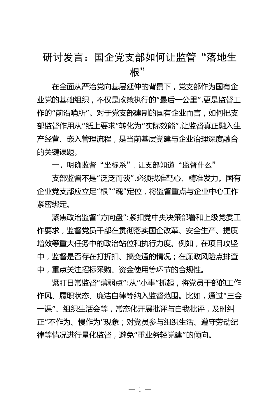 研討發(fā)言:國企黨支部如何讓監(jiān)管“落地生根”在全面從嚴治黨向基層延伸的背景下,黨支部作為國有企“”業(yè)黨的基礎(chǔ)組織,不僅是政策執(zhí)行的最后一公里,更是監(jiān)督工“”作的前沿哨所。對于黨支部建制的國有企業(yè)而言,如何把支“”“”部監(jiān)督作用從紙上要求轉(zhuǎn)化為實際效能,讓監(jiān)督真正融入生產(chǎn)經(jīng)營、嵌入管理流程,是當前基層黨建與企業(yè)治理深度融合的關(guān)鍵課題。一、明確監(jiān)督“坐標系”,讓支部知道“監(jiān)督什么”“”支部監(jiān)督不是泛泛而談,必須找準靶心、精準發(fā)力。國有“”“”企業(yè)黨支部應(yīng)立足根魂定位,將監(jiān)督重點與企業(yè)中心工作緊密綁定?!啊本劢拐伪O(jiān)督方向盤:緊扣黨中央...