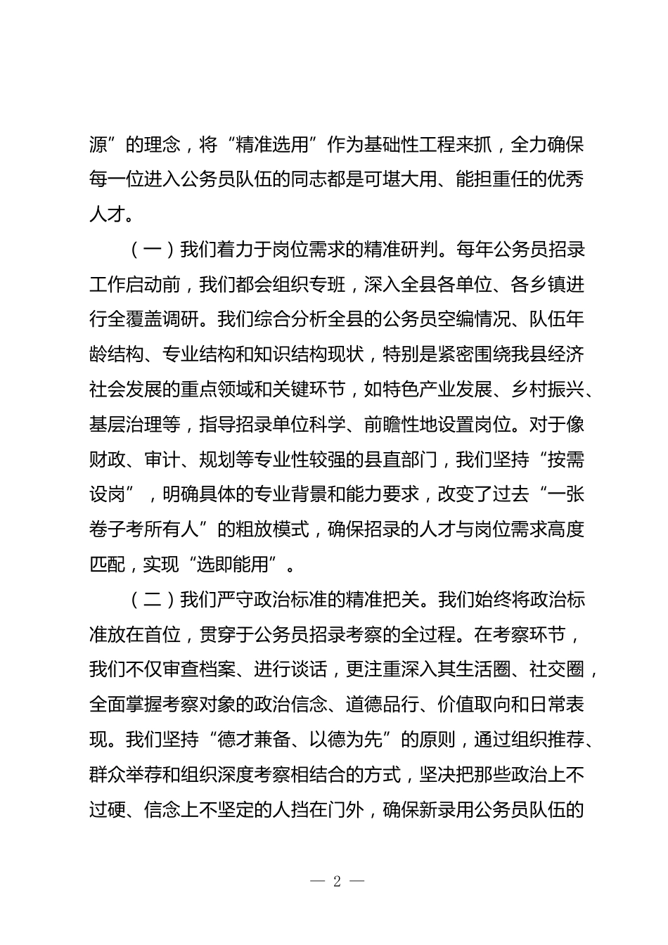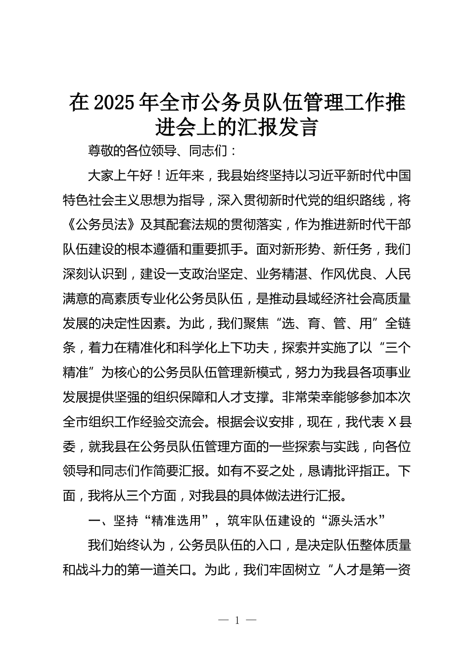 在2025年全市公務(wù)員隊(duì)伍管理工作推進(jìn)會(huì)上的匯報(bào)發(fā)言尊敬的各位領(lǐng)導(dǎo)、同志們:大家上午好!近年來,我縣始終堅(jiān)持以習(xí)近平新時(shí)代中國(guó)特色社會(huì)主義思想為指導(dǎo),深入貫徹新時(shí)代黨的組織路線,將《公務(wù)員法》及其配套法規(guī)的貫徹落實(shí),作為推進(jìn)新時(shí)代干部隊(duì)伍建設(shè)的根本遵循和重要抓手。面對(duì)新形勢(shì)、新任務(wù),我們深刻認(rèn)識(shí)到,建設(shè)一支政治堅(jiān)定、業(yè)務(wù)精湛、作風(fēng)優(yōu)良、人民滿意的高素質(zhì)專業(yè)化公務(wù)員隊(duì)伍,是推動(dòng)縣域經(jīng)濟(jì)社會(huì)高質(zhì)量發(fā)展的決定性因素。為此,我們聚焦“選、育、管、用”全鏈條,著力在精準(zhǔn)化和科學(xué)化上下功夫,探索并實(shí)施了以“三個(gè)精準(zhǔn)”為核心的公務(wù)員隊(duì)伍管理新...