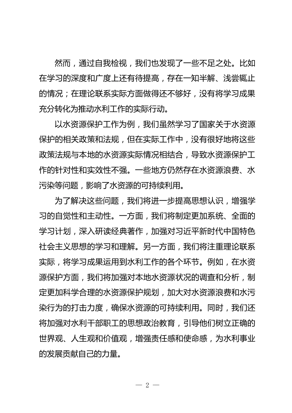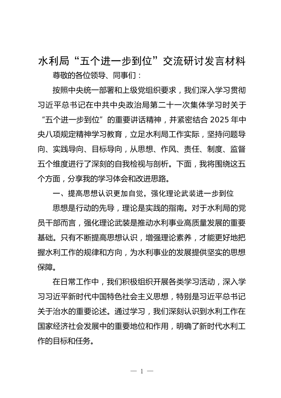 水利局“五個(gè)進(jìn)一步到位”交流研討發(fā)言材料尊敬的各位領(lǐng)導(dǎo)、同事們:按照中央統(tǒng)一部署和上級(jí)黨組織要求,我們深入學(xué)習(xí)貫徹習(xí)近平總書記在中共中央政治局第二十一次集體學(xué)習(xí)時(shí)關(guān)于“五個(gè)進(jìn)一步到位”的重要講話精神,并緊密結(jié)合2025年中央八項(xiàng)規(guī)定精神學(xué)習(xí)教育,立足水利局工作實(shí)際,堅(jiān)持問題導(dǎo)向、實(shí)踐導(dǎo)向、目標(biāo)導(dǎo)向,從思想、作風(fēng)、責(zé)任、制度、監(jiān)督五個(gè)維度進(jìn)行了深刻的自我檢視與剖析。下面,我將圍繞這五個(gè)方面,分享我的學(xué)習(xí)體會(huì)和改進(jìn)思路。一、提高思想認(rèn)識(shí)更加自覺,強(qiáng)化理論武裝進(jìn)一步到位思想是行動(dòng)的先導(dǎo),理論是實(shí)踐的指南。對(duì)于水利局的黨員干部而言,強(qiáng)化...