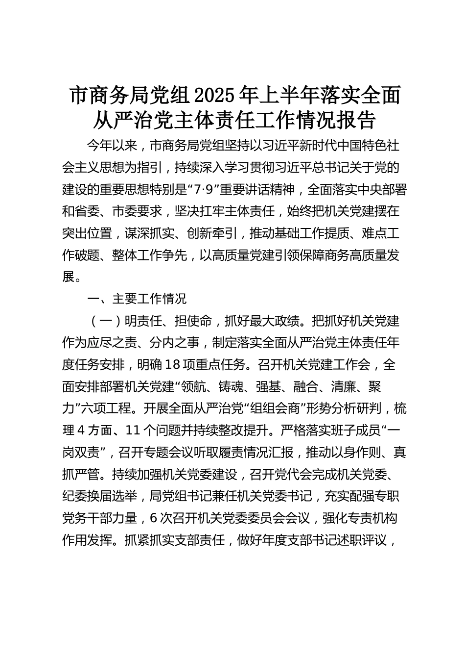 市商務(wù)局黨組2025年上半年落實全面從嚴(yán)治黨主體責(zé)任工作情況報告今年以來,市商務(wù)局黨組堅持以習(xí)近平新時代中國特色社會主義思想為指引,持續(xù)深入學(xué)習(xí)貫徹習(xí)近平總書記關(guān)于黨的“建設(shè)的重要思想特別是7·9”重要講話精神,全面落實中央部署和省委、市委要求,堅決扛牢主體責(zé)任,始終把機關(guān)黨建擺在突出位置,謀深抓實、創(chuàng)新牽引,推動基礎(chǔ)工作提質(zhì)、難點工作破題、整體工作爭先,以高質(zhì)量黨建引領(lǐng)保障商務(wù)高質(zhì)量發(fā)展。一、主要工作情況(一)明責(zé)任、擔(dān)使命,抓好最大政績。把抓好機關(guān)黨建作為應(yīng)盡之責(zé)、分內(nèi)之事,制定落實全面從嚴(yán)治黨主體責(zé)任年度任務(wù)安排,明確18項重...