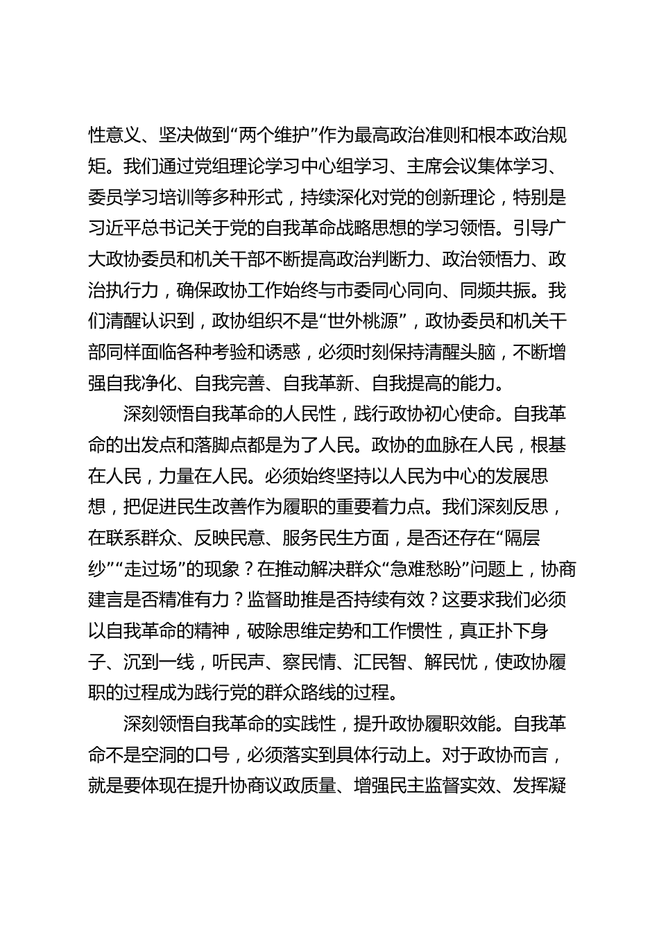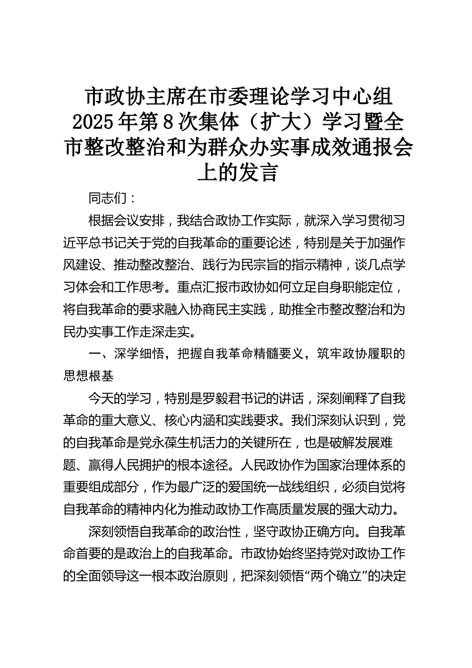 市政協(xié)主席在市委理論學(xué)習(xí)中心組2025年第8次集體(擴(kuò)大)學(xué)習(xí)暨全市整改整治和為群眾辦實(shí)事成效通報(bào)會(huì)上的發(fā)言同志們:根據(jù)會(huì)議安排,我結(jié)合政協(xié)工作實(shí)際,就深入學(xué)習(xí)貫徹習(xí)近平總書記關(guān)于黨的自我革命的重要論述,特別是關(guān)于加強(qiáng)作風(fēng)建設(shè)、推動(dòng)整改整治、踐行為民宗旨的指示精神,談幾點(diǎn)學(xué)習(xí)體會(huì)和工作思考。重點(diǎn)匯報(bào)市政協(xié)如何立足自身職能定位,將自我革命的要求融入?yún)f(xié)商民主實(shí)踐,助推全市整改整治和為民辦實(shí)事工作走深走實(shí)。一、深學(xué)細(xì)悟,把握自我革命精髓要義,筑牢政協(xié)履職的思想根基今天的學(xué)習(xí),特別是羅毅君書記的講話,深刻闡釋了自我革命的重大意義、核心內(nèi)...