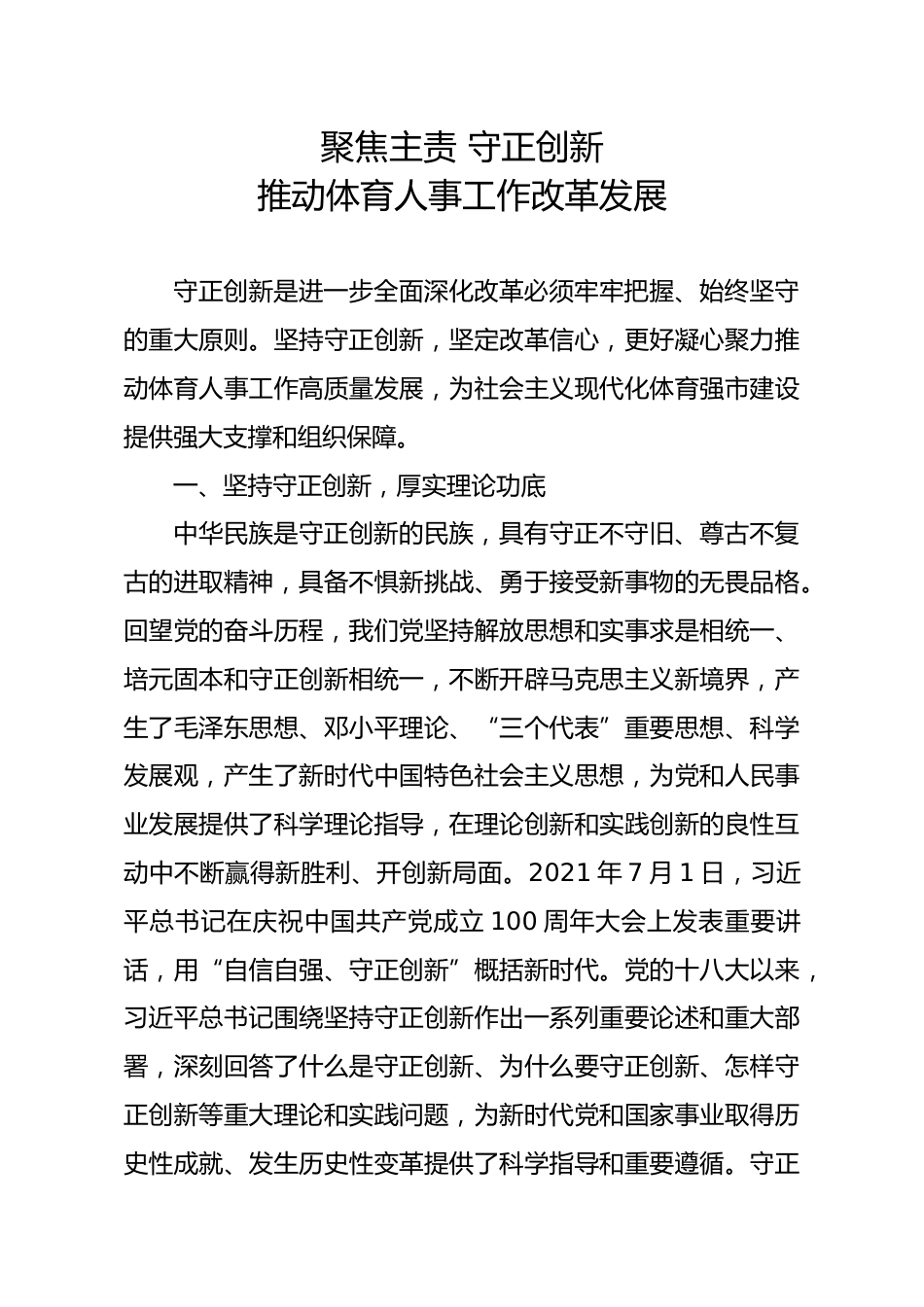 聚焦主責(zé)守正創(chuàng)新推動(dòng)體育人事工作改革發(fā)展守正創(chuàng)新是進(jìn)一步全面深化改革必須牢牢把握、始終堅(jiān)守的重大原則。堅(jiān)持守正創(chuàng)新,堅(jiān)定改革信心,更好凝心聚力推動(dòng)體育人事工作高質(zhì)量發(fā)展,為社會(huì)主義現(xiàn)代化體育強(qiáng)市建設(shè)提供強(qiáng)大支撐和組織保障。一、堅(jiān)持守正創(chuàng)新,厚實(shí)理論功底中華民族是守正創(chuàng)新的民族,具有守正不守舊、尊古不復(fù)古的進(jìn)取精神,具備不懼新挑戰(zhàn)、勇于接受新事物的無畏品格?;赝h的奮斗歷程,我們黨堅(jiān)持解放思想和實(shí)事求是相統(tǒng)一、培元固本和守正創(chuàng)新相統(tǒng)一,不斷開辟馬克思主義新境界,產(chǎn)生了毛澤東思想、鄧小平理論、“三個(gè)代表”重要思想、科學(xué)發(fā)展觀,產(chǎn)...