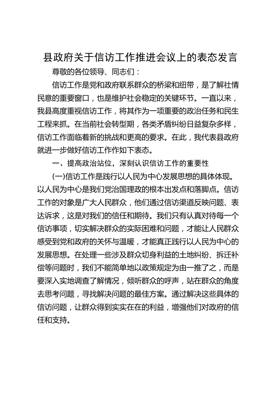 縣政府關(guān)于信訪工作推進(jìn)會議上的表態(tài)發(fā)言尊敬的各位領(lǐng)導(dǎo)、同志們:信訪工作是黨和政府聯(lián)系群眾的橋梁和紐帶,是了解社情民意的重要窗口,也是維護(hù)社會穩(wěn)定的關(guān)鍵環(huán)節(jié)。一直以來,我縣高度重視信訪工作,將其作為一項(xiàng)重要的政治任務(wù)和民生工程來抓。在當(dāng)前社會轉(zhuǎn)型期,各類矛盾糾紛日益復(fù)雜多樣,信訪工作面臨著新的挑戰(zhàn)和更高的要求。在此,我代表縣政府就進(jìn)一步做好信訪工作作如下表態(tài)。一、提高政治站位,深刻認(rèn)識信訪工作的重要性(一)信訪工作是踐行以人民為中心發(fā)展思想的具體體現(xiàn)。以人民為中心是我們黨治國理政的根本出發(fā)點(diǎn)和落腳點(diǎn)。信訪工作的對象是廣大人民群眾...