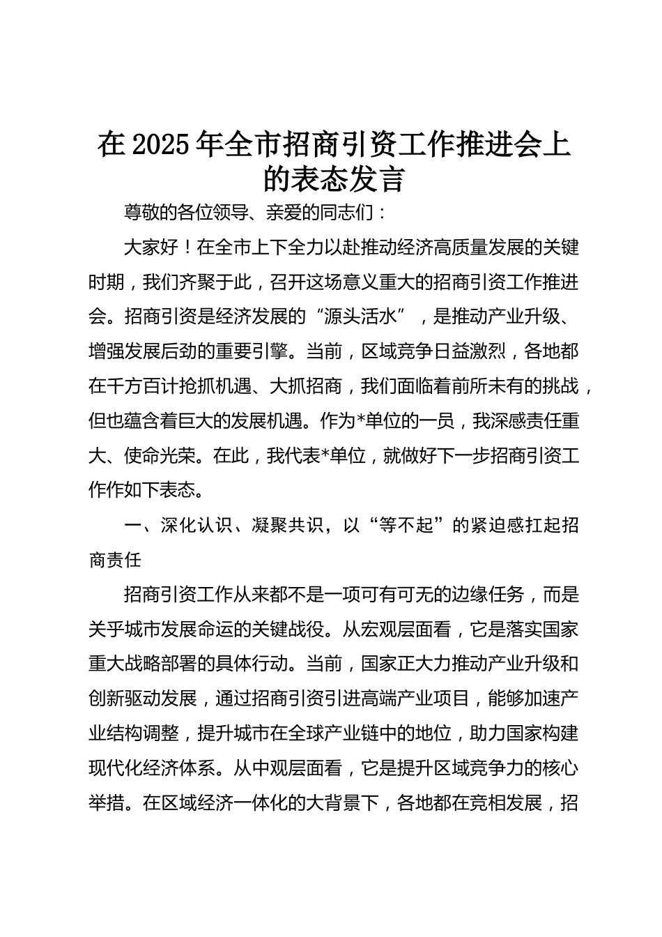 在2025年全市招商引資工作推進(jìn)會(huì)上的表態(tài)發(fā)言尊敬的各位領(lǐng)導(dǎo)、親愛的同志們:大家好!在全市上下全力以赴推動(dòng)經(jīng)濟(jì)高質(zhì)量發(fā)展的關(guān)鍵時(shí)期,我們齊聚于此,召開這場(chǎng)意義重大的招商引資工作推進(jìn)會(huì)。招商引資是經(jīng)濟(jì)發(fā)展的“源頭活水”,是推動(dòng)產(chǎn)業(yè)升級(jí)、增強(qiáng)發(fā)展后勁的重要引擎。當(dāng)前,區(qū)域競(jìng)爭(zhēng)日益激烈,各地都在千方百計(jì)搶抓機(jī)遇、大抓招商,我們面臨著前所未有的挑戰(zhàn),但也蘊(yùn)含著巨大的發(fā)展機(jī)遇。作為*單位的一員,我深感責(zé)任重大、使命光榮。在此,我代表*單位,就做好下一步招商引資工作作如下表態(tài)。一、深化認(rèn)識(shí)、凝聚共識(shí),以“等不起”的緊迫感扛起招商責(zé)任招商引資工...