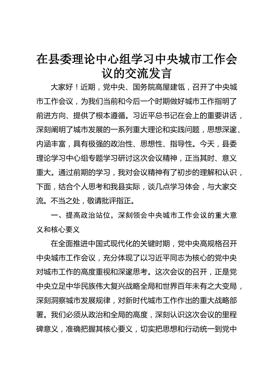 在縣委理論中心組學(xué)習(xí)中央城市工作會議的交流發(fā)言大家好!近期,黨中央、國務(wù)院高屋建瓴,召開了中央城市工作會議,為我們當(dāng)前和今后一個時期做好城市工作指明了前進(jìn)方向、提供了根本遵循。習(xí)近平總書記在會上的重要講話,深刻闡明了城市發(fā)展的一系列重大理論和實踐問題,思想深邃、內(nèi)涵豐富,具有極強的政治性、思想性、指導(dǎo)性。今天,縣委理論學(xué)習(xí)中心組專題學(xué)習(xí)研討這次會議精神,正當(dāng)其時、意義重大。通過前期的學(xué)習(xí),我對會議精神有了初步的理解和認(rèn)識,下面,結(jié)合個人思考和我縣實際,談幾點學(xué)習(xí)體會,與大家交流。不當(dāng)之處,敬請批評指正。一、提高政治站位,深刻...