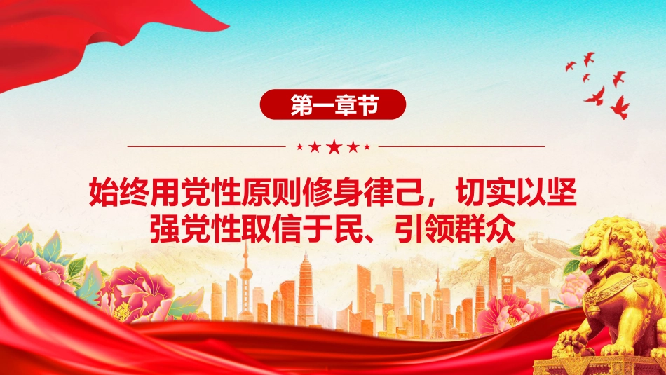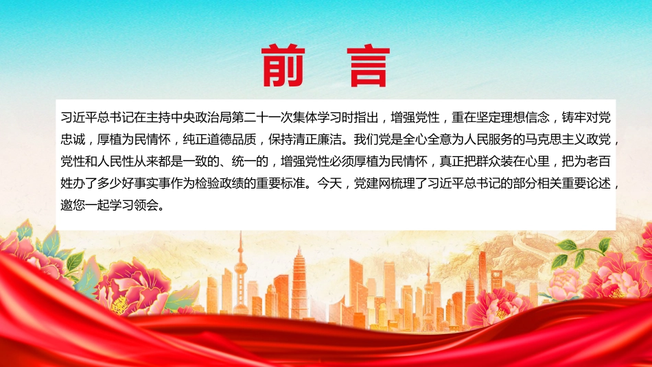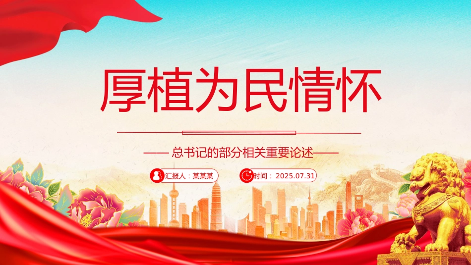厚植為民情懷——總書記的部分相關(guān)重要論述——匯報(bào)人:某某某時(shí)間:2025.07.31前言習(xí)近平總書記在主持中央政治局第二十一次集體學(xué)習(xí)時(shí)指出,增強(qiáng)黨性,重在堅(jiān)定理想信念,鑄牢對黨忠誠,厚植為民情懷,純正道德品質(zhì),保持清正廉潔。我們黨是全心全意為人民服務(wù)的馬克思主義政黨,黨性和人民性從來都是一致的、統(tǒng)一的,增強(qiáng)黨性必須厚植為民情懷,真正把群眾裝在心里,把為老百姓辦了多少好事實(shí)事作為檢驗(yàn)政績的重要標(biāo)準(zhǔn)。今天,黨建網(wǎng)梳理了習(xí)近平總書記的部分相關(guān)重要論述,邀您一起學(xué)習(xí)領(lǐng)會。始終用黨性原則修身律己,切實(shí)以堅(jiān)強(qiáng)黨性取信于民、引領(lǐng)群眾第一章節(jié)第一部...