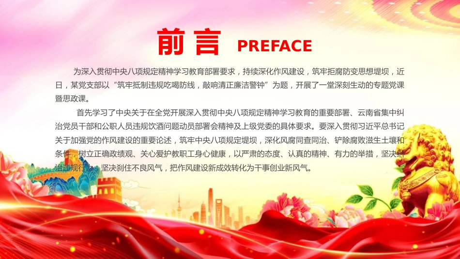 糾治違規(guī)吃喝筑牢作風(fēng)建設(shè)防線授課人:某某某時(shí)間:2025.07.30“筑牢抵制違規(guī)吃喝防線,敲響清正廉潔警鐘”為深入貫徹中央八項(xiàng)規(guī)定精神學(xué)習(xí)教育部署要求,持續(xù)深化作風(fēng)建設(shè),筑牢拒腐防變思想堤壩,近日,某黨支部以“筑牢抵制違規(guī)吃喝防線,敲響清正廉潔警鐘”為題,開(kāi)展了一堂深刻生動(dòng)的專題黨課暨思政課。首先學(xué)習(xí)了中央關(guān)于在全黨開(kāi)展深入貫徹中央八項(xiàng)規(guī)定精神學(xué)習(xí)教育的重要部署、云南省集中糾治黨員干部和公職人員違規(guī)飲酒問(wèn)題動(dòng)員部署會(huì)精神及上級(jí)黨委的具體要求。要深入貫徹習(xí)近平總書(shū)記關(guān)于加強(qiáng)黨的作風(fēng)建設(shè)的重要論述,筑牢中央八項(xiàng)規(guī)定堤壩,深化風(fēng)腐同查同治...