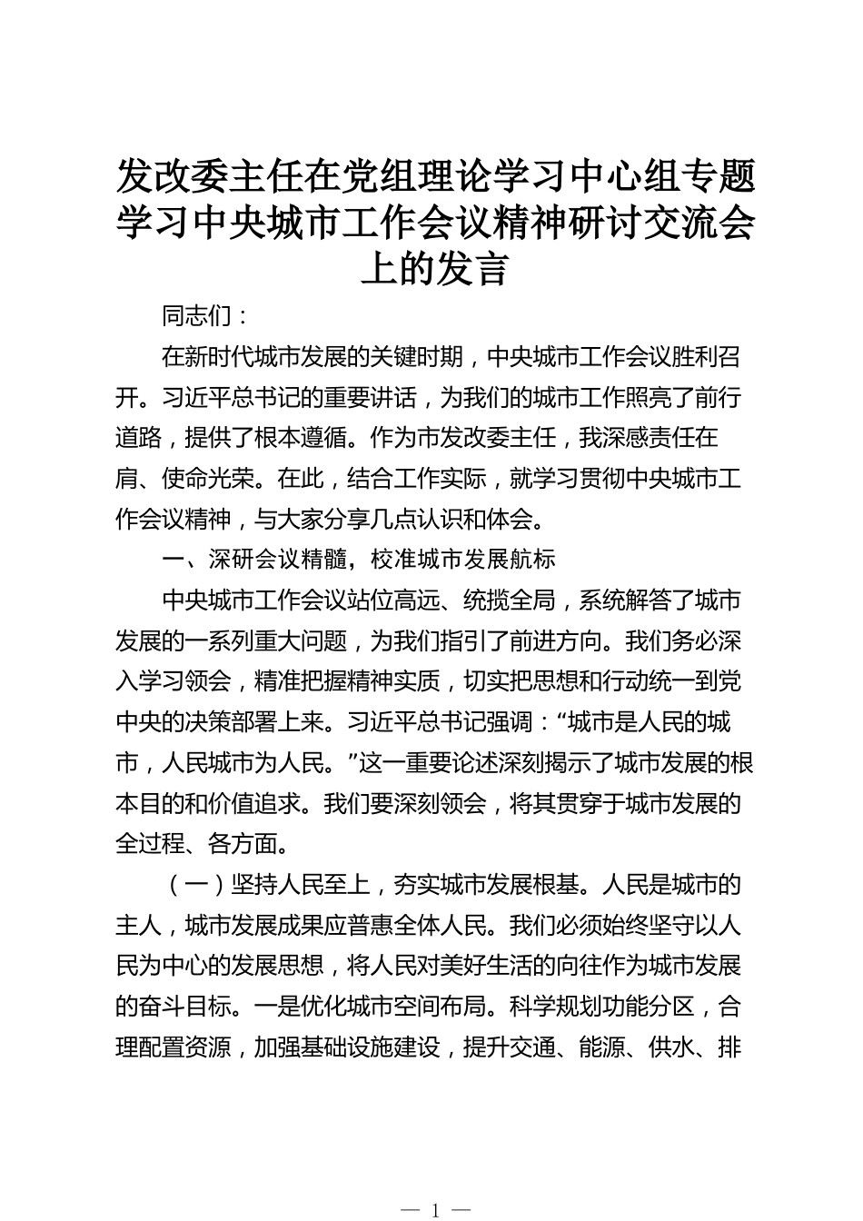 發(fā)改委主任在黨組理論學(xué)習(xí)中心組專題學(xué)習(xí)中央城市工作會議精神研討交流會上的發(fā)言VIP免費