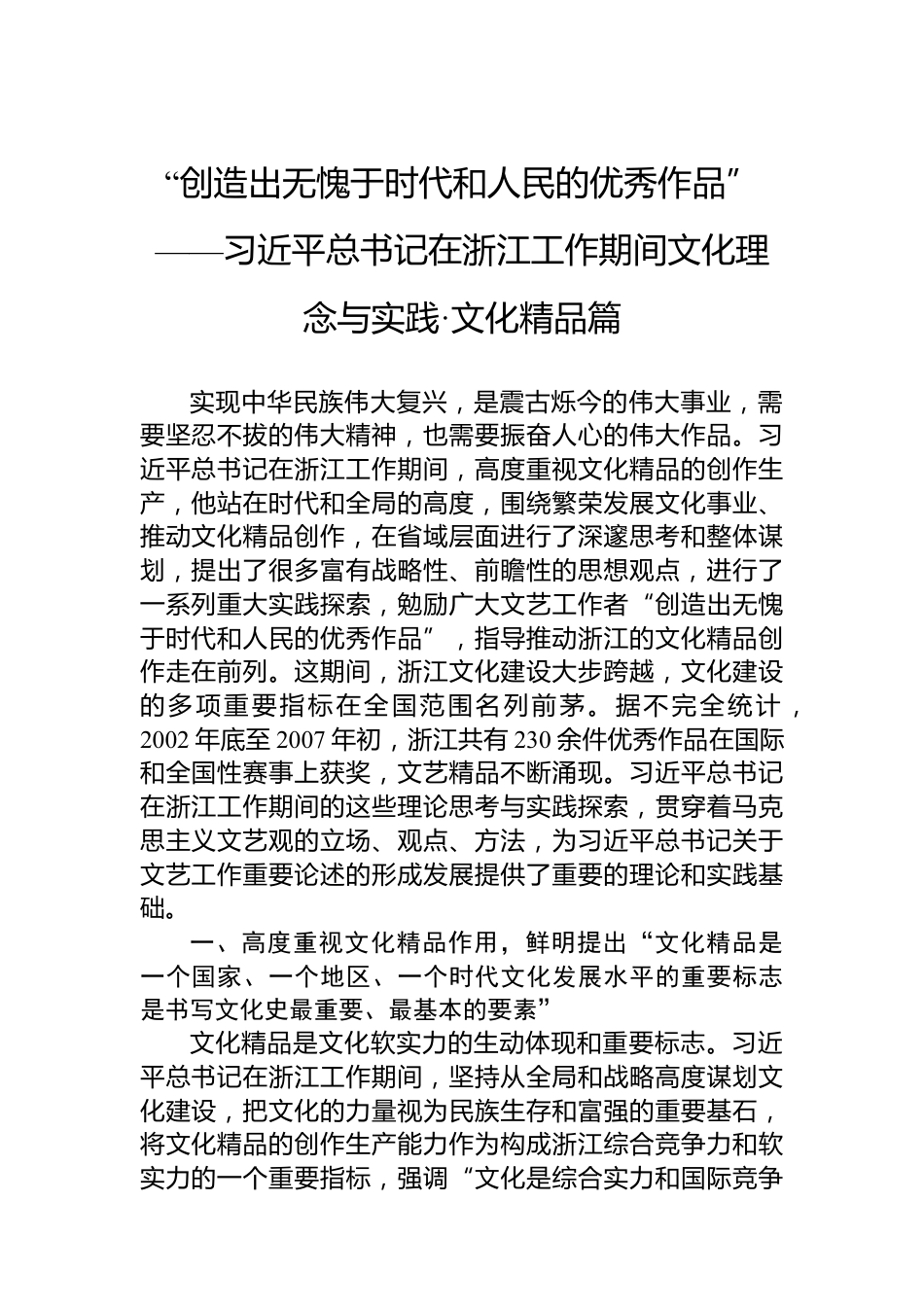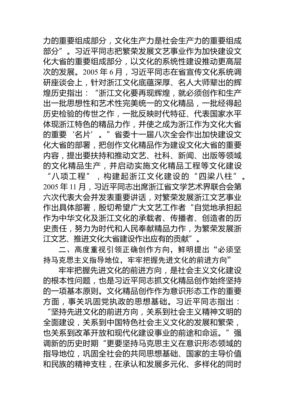 “創(chuàng)造出無(wú)愧于時(shí)代和人民的優(yōu)秀作品”——習(xí)近平總書(shū)記在浙江工作期間文化理念與實(shí)踐·文化精品篇實(shí)現(xiàn)中華民族偉大復(fù)興,是震古爍今的偉大事業(yè),需要堅(jiān)忍不拔的偉大精神,也需要振奮人心的偉大作品。習(xí)近平總書(shū)記在浙江工作期間,高度重視文化精品的創(chuàng)作生產(chǎn),他站在時(shí)代和全局的高度,圍繞繁榮發(fā)展文化事業(yè)、推動(dòng)文化精品創(chuàng)作,在省域?qū)用孢M(jìn)行了深邃思考和整體謀劃,提出了很多富有戰(zhàn)略性、前瞻性的思想觀點(diǎn),進(jìn)行了一系列重大實(shí)踐探索,勉勵(lì)廣大文藝工作者“創(chuàng)造出無(wú)愧于時(shí)代和人民的優(yōu)秀作品”,指導(dǎo)推動(dòng)浙江的文化精品創(chuàng)作走在前列。這期間,浙江文化建設(shè)大步跨越,...