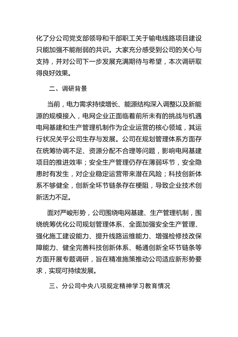關(guān)于全面加強(qiáng)安全生產(chǎn)管理、強(qiáng)化施工建設(shè)能力的調(diào)研報(bào)告為貫徹落實(shí)中央八項(xiàng)規(guī)定精神學(xué)習(xí)教育任務(wù)要求,詳細(xì)了解基層單位開展學(xué)習(xí)教育學(xué)查改情況,廣泛聽取基層職工群眾對(duì)公司領(lǐng)導(dǎo)班子和領(lǐng)導(dǎo)干部的意見建議,認(rèn)真查找作風(fēng)建設(shè)方面存在的問題,同時(shí),聚焦貫徹落實(shí)習(xí)近平總書記重要指示批示精神和黨中央重大決策部署,聚焦制約“省公司專業(yè)型送變電”建設(shè)的重點(diǎn)難點(diǎn)問題,聚集職工群眾的急難愁盼,公司副總經(jīng)理、黨委委員張冬升及安全監(jiān)察部相關(guān)人員組成調(diào)研組,于2025年6月20日,在分公司開展專題調(diào)研,現(xiàn)將有關(guān)情況報(bào)告如下。一、調(diào)研基本情況調(diào)研組圍繞全面加強(qiáng)安全生產(chǎn)...