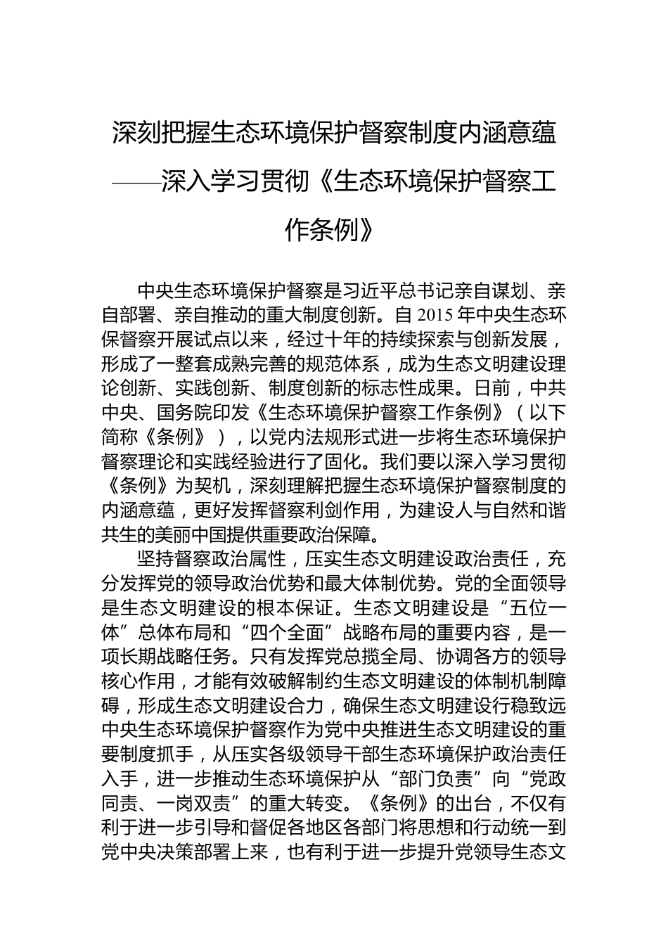 深刻把握生態(tài)環(huán)境保護(hù)督察制度內(nèi)涵意蘊(yùn)——深入學(xué)習(xí)貫徹《生態(tài)環(huán)境保護(hù)督察工作條例》中央生態(tài)環(huán)境保護(hù)督察是習(xí)近平總書記親自謀劃、親自部署、親自推動(dòng)的重大制度創(chuàng)新。自2015年中央生態(tài)環(huán)保督察開展試點(diǎn)以來,經(jīng)過十年的持續(xù)探索與創(chuàng)新發(fā)展,形成了一整套成熟完善的規(guī)范體系,成為生態(tài)文明建設(shè)理論創(chuàng)新、實(shí)踐創(chuàng)新、制度創(chuàng)新的標(biāo)志性成果。日前,中共中央、國(guó)務(wù)院印發(fā)《生態(tài)環(huán)境保護(hù)督察工作條例》(以下簡(jiǎn)稱《條例》),以黨內(nèi)法規(guī)形式進(jìn)一步將生態(tài)環(huán)境保護(hù)督察理論和實(shí)踐經(jīng)驗(yàn)進(jìn)行了固化。我們要以深入學(xué)習(xí)貫徹《條例》為契機(jī),深刻理解把握生態(tài)環(huán)境保護(hù)督察制度的內(nèi)涵...