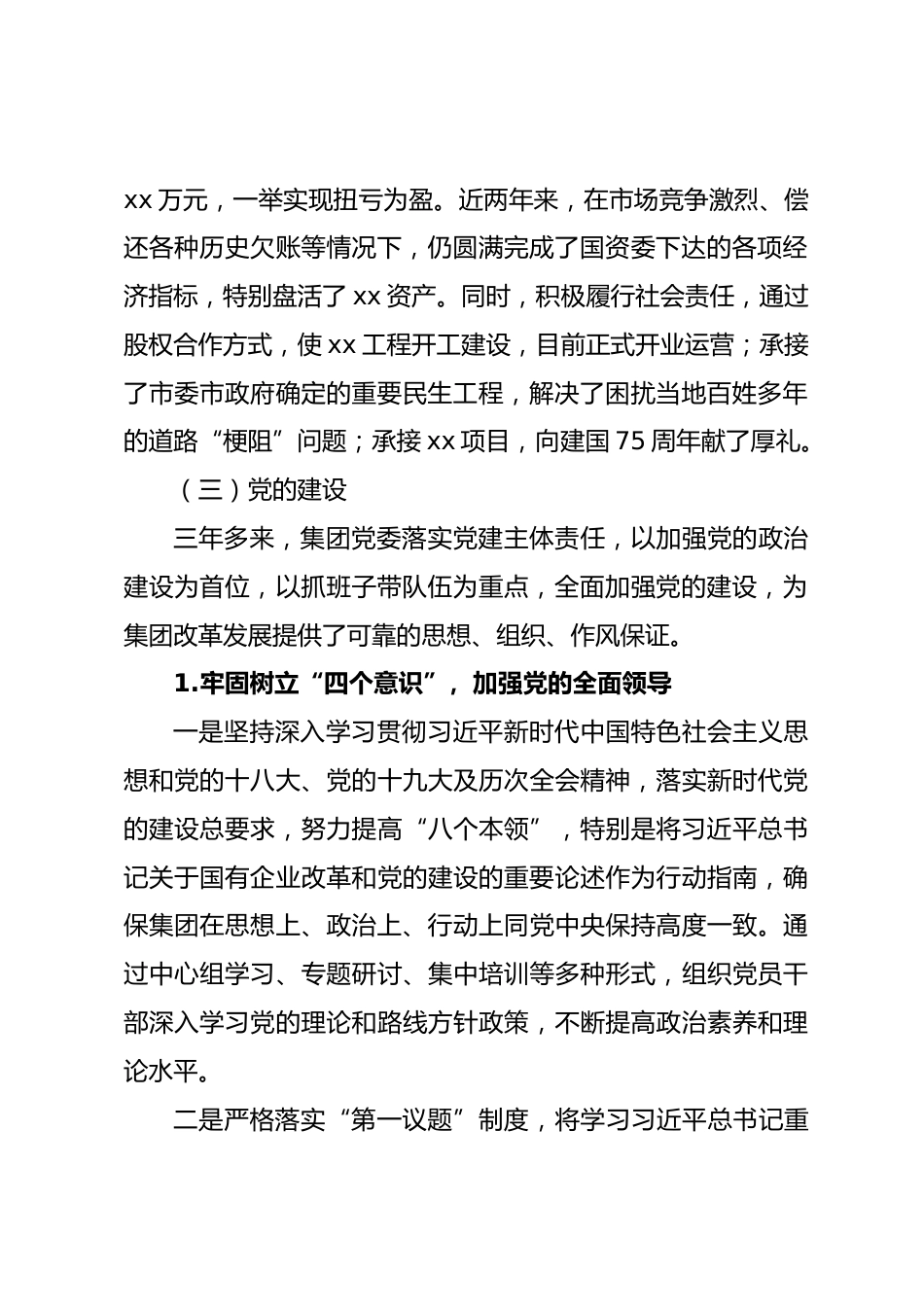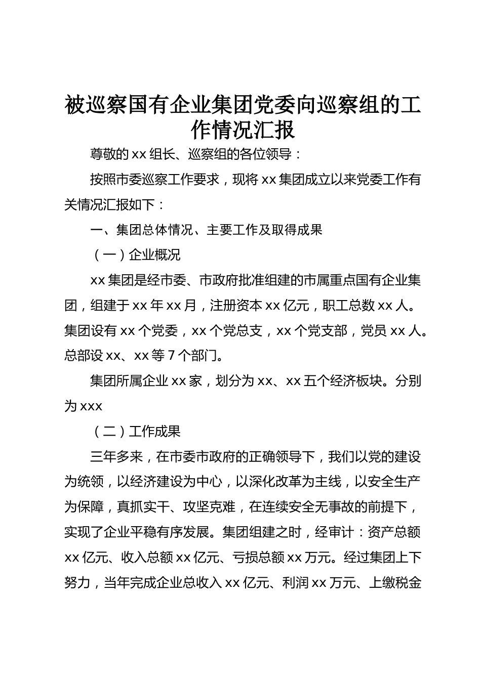 被巡察國有企業(yè)集團(tuán)黨委向巡察組的工作情況匯報(bào)尊敬的xx組長、巡察組的各位領(lǐng)導(dǎo):按照市委巡察工作要求,現(xiàn)將xx集團(tuán)成立以來黨委工作有關(guān)情況匯報(bào)如下:一、集團(tuán)總體情況、主要工作及取得成果(一)企業(yè)概況xx集團(tuán)是經(jīng)市委、市政府批準(zhǔn)組建的市屬重點(diǎn)國有企業(yè)集團(tuán),組建于xx年xx月,注冊資本xx億元,職工總數(shù)xx人。集團(tuán)設(shè)有xx個(gè)黨委,xx個(gè)黨總支,xx個(gè)黨支部,黨員xx人??偛吭O(shè)xx、xx等7個(gè)部門。集團(tuán)所屬企業(yè)xx家,劃分為xx、xx五個(gè)經(jīng)濟(jì)板塊。分別為xxx(二)工作成果三年多來,在市委市政府的正確領(lǐng)導(dǎo)下,我們以黨的建設(shè)為統(tǒng)領(lǐng),以經(jīng)濟(jì)建設(shè)為中心,以深化改革為主線,以...