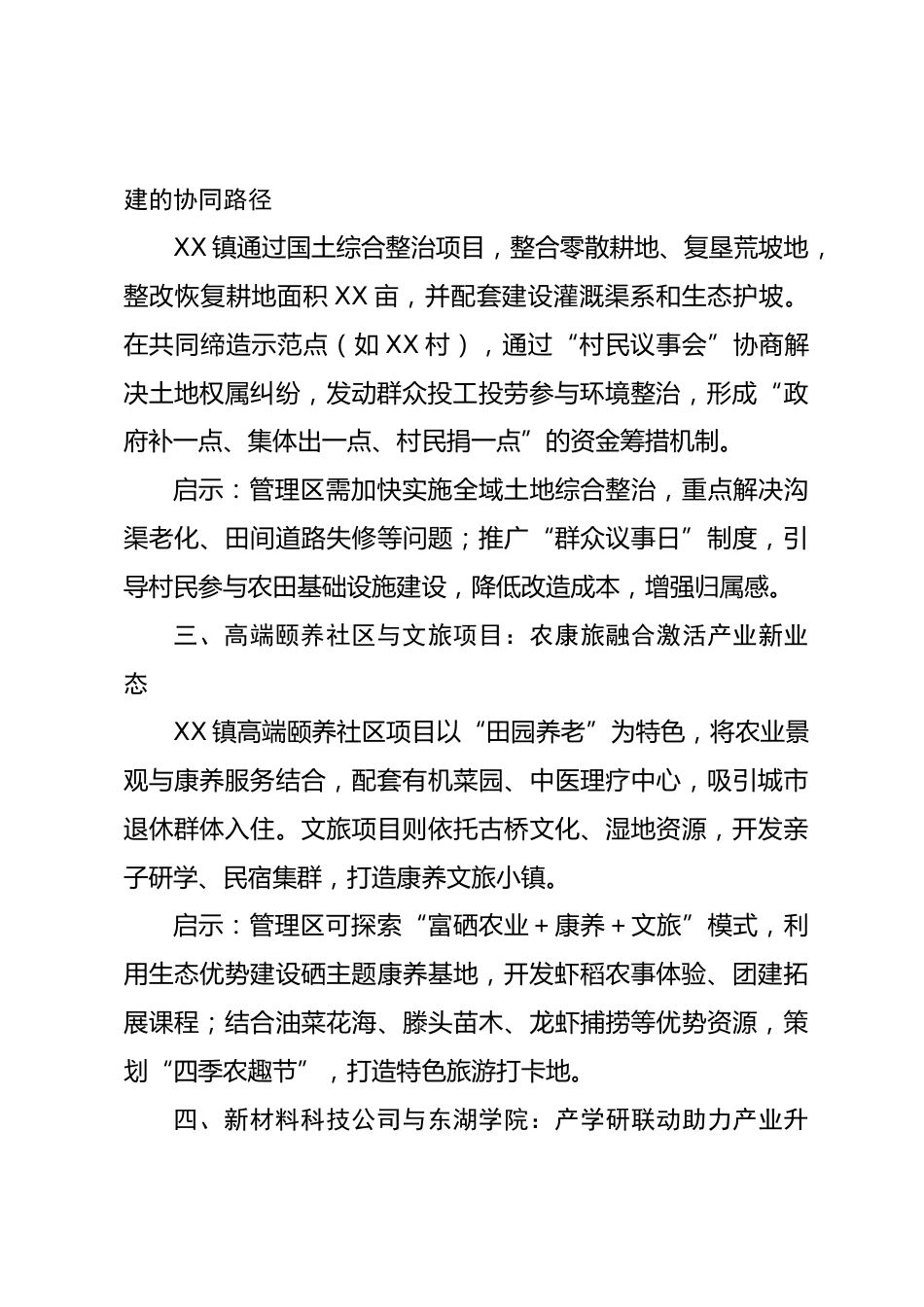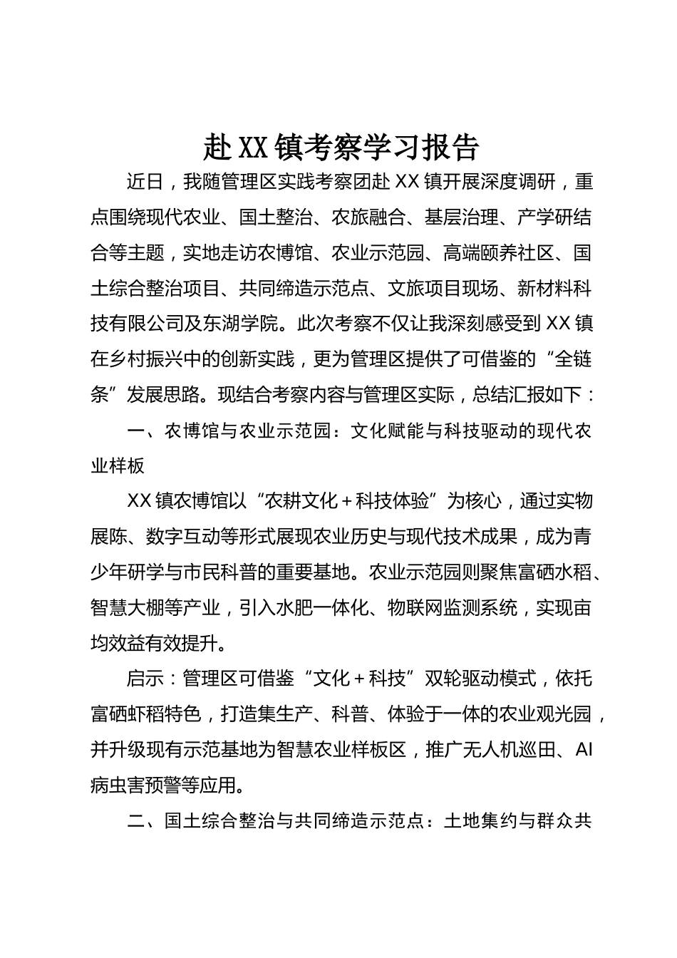赴XX鎮(zhèn)考察學(xué)習(xí)報告近日,我隨管理區(qū)實踐考察團赴XX鎮(zhèn)開展深度調(diào)研,重點圍繞現(xiàn)代農(nóng)業(yè)、國土整治、農(nóng)旅融合、基層治理、產(chǎn)學(xué)研結(jié)合等主題,實地走訪農(nóng)博館、農(nóng)業(yè)示范園、高端頤養(yǎng)社區(qū)、國土綜合整治項目、共同締造示范點、文旅項目現(xiàn)場、新材料科技有限公司及東湖學(xué)院。此次考察不僅讓我深刻感受到XX鎮(zhèn)在鄉(xiāng)村振興中的創(chuàng)新實踐,更為管理區(qū)提供了可借鑒的“全鏈條”發(fā)展思路。現(xiàn)結(jié)合考察內(nèi)容與管理區(qū)實際,總結(jié)匯報如下:一、農(nóng)博館與農(nóng)業(yè)示范園:文化賦能與科技驅(qū)動的現(xiàn)代農(nóng)業(yè)樣板XX鎮(zhèn)農(nóng)博館以“農(nóng)耕文化+科技體驗”為核心,通過實物展陳、數(shù)字互動等形式展現(xiàn)農(nóng)業(yè)歷史與...
