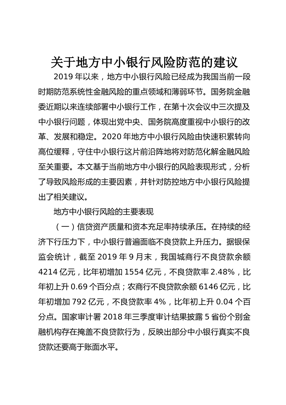 關(guān)于地方中小銀行風險防范的建議2019年以來,地方中小銀行風險已經(jīng)成為我國當前一段時期防范系統(tǒng)性金融風險的重點領(lǐng)域和薄弱環(huán)節(jié)。國務(wù)院金融委近期以來連續(xù)部署中小銀行工作,在第十次會議中三次提及中小銀行問題,體現(xiàn)出黨中央、國務(wù)院高度重視中小銀行的改革、發(fā)展和穩(wěn)定。2020年地方中小銀行風險由快速積累轉(zhuǎn)向高位緩釋,守住中小銀行這片前沿陣地將對防范化解金融風險至關(guān)重要。本文基于當前地方中小銀行的風險表現(xiàn)形式,分析了導致風險形成的主要因素,并針對防控地方中小銀行風險提出了相關(guān)建議。地方中小銀行風險的主要表現(xiàn)(一)信貸資產(chǎn)質(zhì)量和資本充足率持續(xù)承...