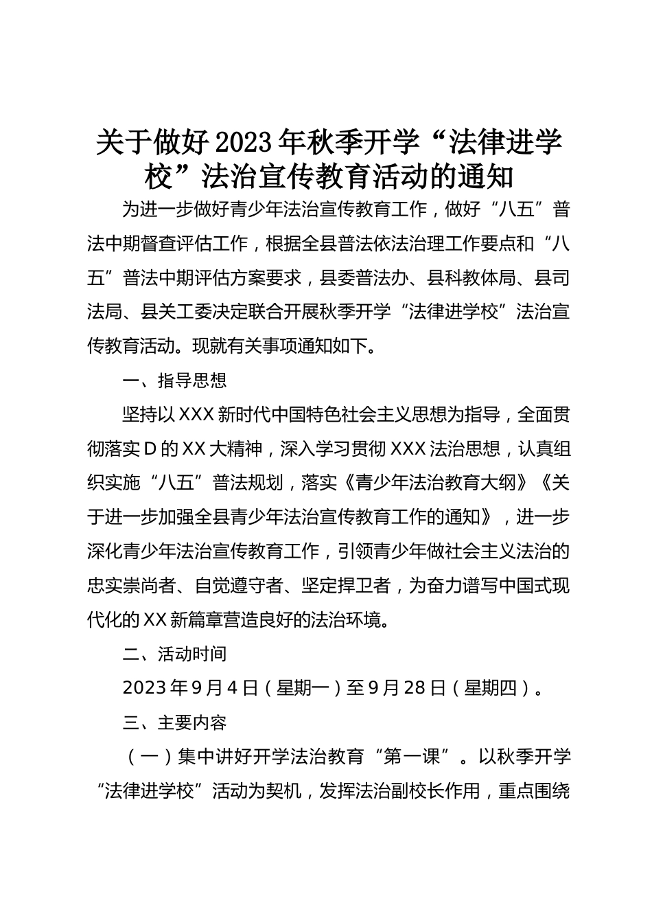 關(guān)于做好2023年秋季開學(xué)“法律進(jìn)學(xué)校”法治宣傳教育活動(dòng)的通知為進(jìn)一步做好青少年法治宣傳教育工作,做好“八五”普法中期督查評(píng)估工作,根據(jù)全縣普法依法治理工作要點(diǎn)和“八五”普法中期評(píng)估方案要求,縣委普法辦、縣科教體局、縣司法局、縣關(guān)工委決定聯(lián)合開展秋季開學(xué)“法律進(jìn)學(xué)校”法治宣傳教育活動(dòng)?,F(xiàn)就有關(guān)事項(xiàng)通知如下。一、指導(dǎo)思想堅(jiān)持以XXX新時(shí)代中國(guó)特色社會(huì)主義思想為指導(dǎo),全面貫徹落實(shí)D的XX大精神,深入學(xué)習(xí)貫徹XXX法治思想,認(rèn)真組織實(shí)施“八五”普法規(guī)劃,落實(shí)《青少年法治教育大綱》《關(guān)于進(jìn)一步加強(qiáng)全縣青少年法治宣傳教育工作的通知》,進(jìn)一步深化青...