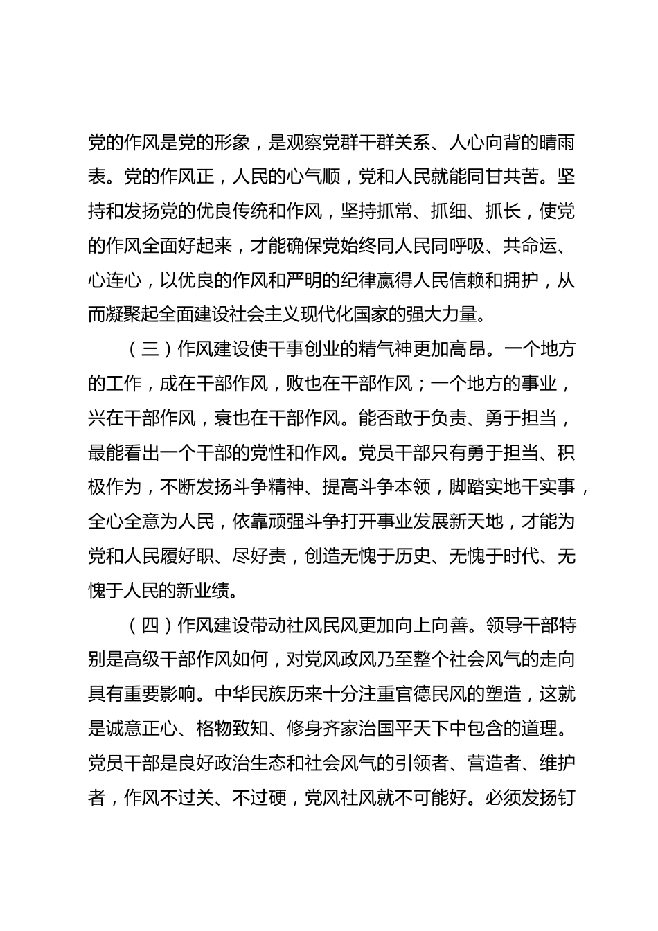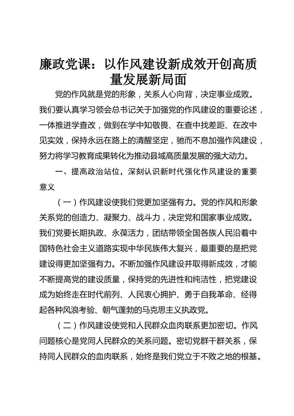 廉政黨課:以作風(fēng)建設(shè)新成效開創(chuàng)高質(zhì)量發(fā)展新局面黨的作風(fēng)就是黨的形象,關(guān)系人心向背,決定事業(yè)成敗。我們要認(rèn)真學(xué)習(xí)領(lǐng)會總書記關(guān)于加強(qiáng)黨的作風(fēng)建設(shè)的重要論述,一體推進(jìn)學(xué)查改,做到在學(xué)中知敬畏、在查中找差距、在改中見實(shí)效,保持永遠(yuǎn)在路上的清醒堅(jiān)定,馳而不息加強(qiáng)作風(fēng)建設(shè),努力將學(xué)習(xí)教育成果轉(zhuǎn)化為推動縣域高質(zhì)量發(fā)展的強(qiáng)大動力。一、提高政治站位,深刻認(rèn)識新時代強(qiáng)化作風(fēng)建設(shè)的重要意義(一)作風(fēng)建設(shè)使我們黨更加堅(jiān)強(qiáng)有力。黨的作風(fēng)和形象關(guān)系黨的創(chuàng)造力、凝聚力、戰(zhàn)斗力,決定黨和國家事業(yè)成敗。我們黨要長期執(zhí)政、永葆活力,團(tuán)結(jié)帶領(lǐng)全國各族人民沿著中國...