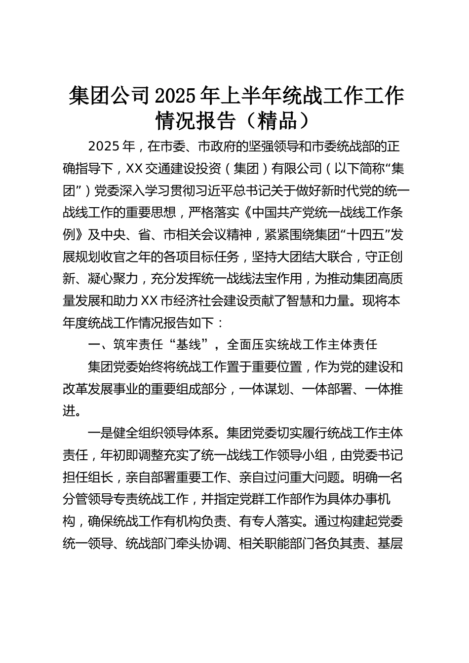 集團公司2025年上半年統(tǒng)戰(zhàn)工作工作情況報告(精品)2025年,在市委、市政府的堅強領(lǐng)導(dǎo)和市委統(tǒng)戰(zhàn)部的正確指導(dǎo)下,XX“交通建設(shè)投資(集團)有限公司(以下簡稱集”團)黨委深入學(xué)習(xí)貫徹習(xí)近平總書記關(guān)于做好新時代黨的統(tǒng)一戰(zhàn)線工作的重要思想,嚴格落實《中國共產(chǎn)黨統(tǒng)一戰(zhàn)線工作條“”例》及中央、省、市相關(guān)會議精神,緊緊圍繞集團十四五發(fā)展規(guī)劃收官之年的各項目標任務(wù),堅持大團結(jié)大聯(lián)合,守正創(chuàng)新、凝心聚力,充分發(fā)揮統(tǒng)一戰(zhàn)線法寶作用,為推動集團高質(zhì)量發(fā)展和助力XX市經(jīng)濟社會建設(shè)貢獻了智慧和力量?,F(xiàn)將本年度統(tǒng)戰(zhàn)工作情況報告如下:一、筑牢責(zé)任“基線”,全面壓...