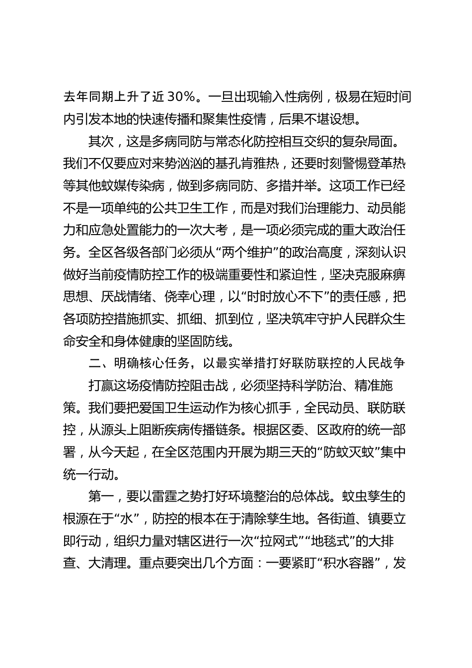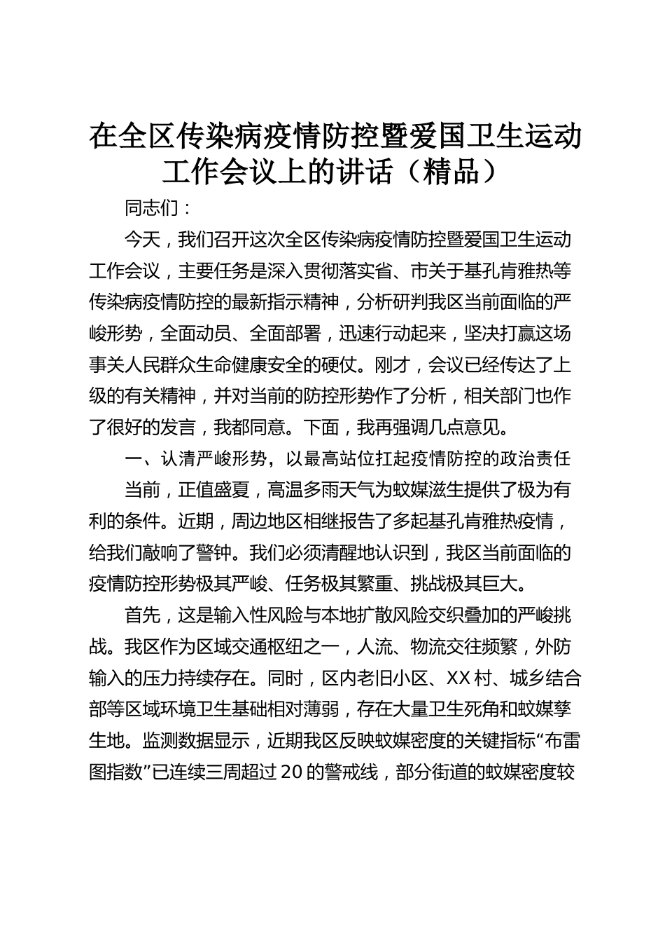 在全區(qū)傳染病疫情防控暨愛國衛(wèi)生運動工作會議上的講話(精品)同志們:今天,我們召開這次全區(qū)傳染病疫情防控暨愛國衛(wèi)生運動工作會議,主要任務是深入貫徹落實省、市關于基孔肯雅熱等傳染病疫情防控的最新指示精神,分析研判我區(qū)當前面臨的嚴峻形勢,全面動員、全面部署,迅速行動起來,堅決打贏這場事關人民群眾生命健康安全的硬仗。剛才,會議已經(jīng)傳達了上級的有關精神,并對當前的防控形勢作了分析,相關部門也作了很好的發(fā)言,我都同意。下面,我再強調(diào)幾點意見。一、認清嚴峻形勢,以最高站位扛起疫情防控的政治責任當前,正值盛夏,高溫多雨天氣為蚊媒滋生提供了極...