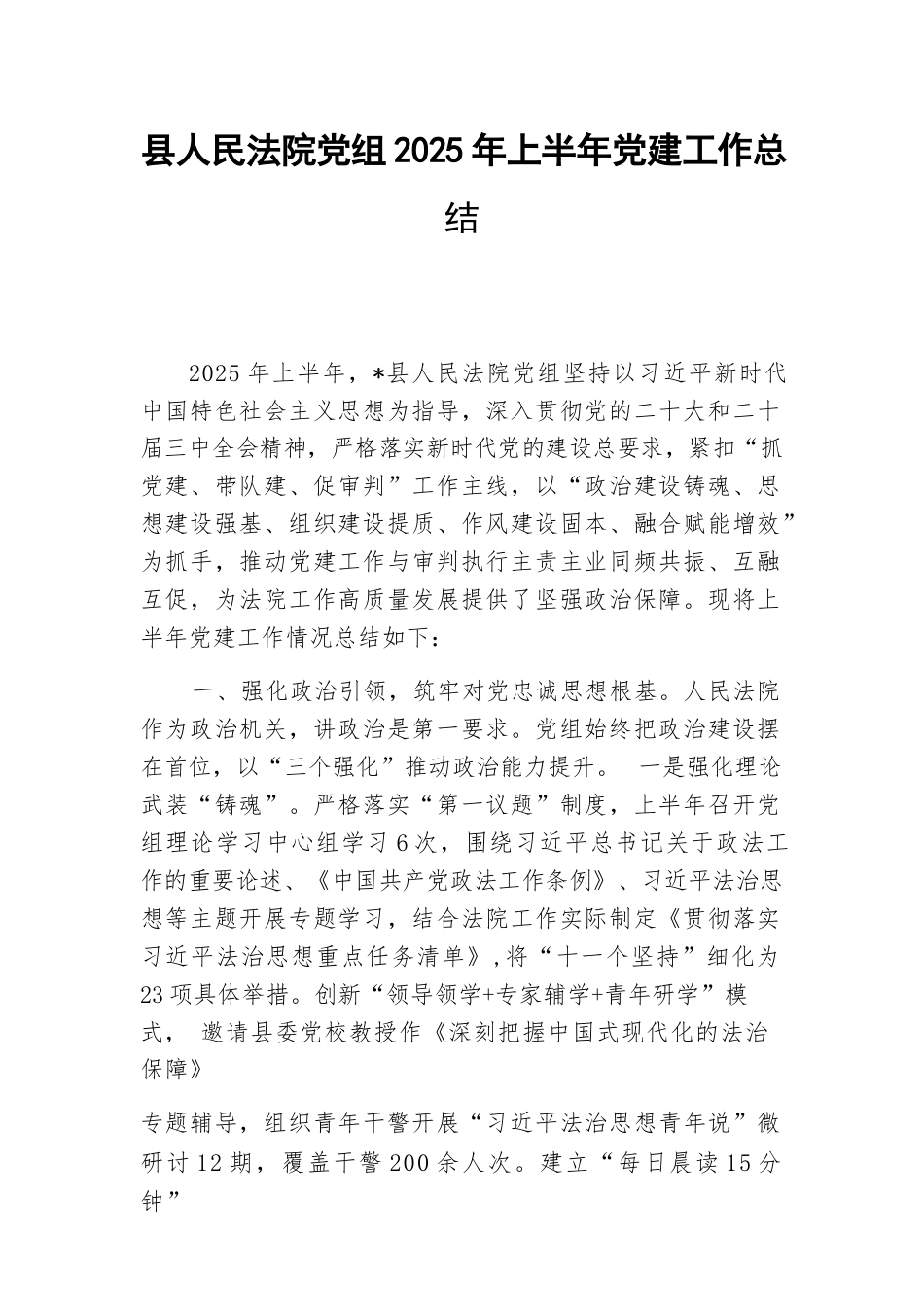 縣人民法院黨組2025年上半年黨建工作總結(jié)2025年上半年,*縣人民法院黨組堅(jiān)持以習(xí)近平新時(shí)代中國(guó)特色社會(huì)主義思想為指導(dǎo),深入貫徹黨的二十大和二十屆三中全會(huì)精神,嚴(yán)格落實(shí)新時(shí)代黨的建設(shè)總要求,緊扣“抓黨建、帶隊(duì)建、促審判”工作主線,以“政治建設(shè)鑄魂、思想建設(shè)強(qiáng)基、組織建設(shè)提質(zhì)、作風(fēng)建設(shè)固本、融合賦能增效”為抓手,推動(dòng)黨建工作與審判執(zhí)行主責(zé)主業(yè)同頻共振、互融互促,為法院工作高質(zhì)量發(fā)展提供了堅(jiān)強(qiáng)政治保障?,F(xiàn)將上半年黨建工作情況總結(jié)如下:一、強(qiáng)化政治引領(lǐng),筑牢對(duì)黨忠誠(chéng)思想根基。人民法院作為政治機(jī)關(guān),講政治是第一要求。黨組始終把政治建設(shè)擺在...